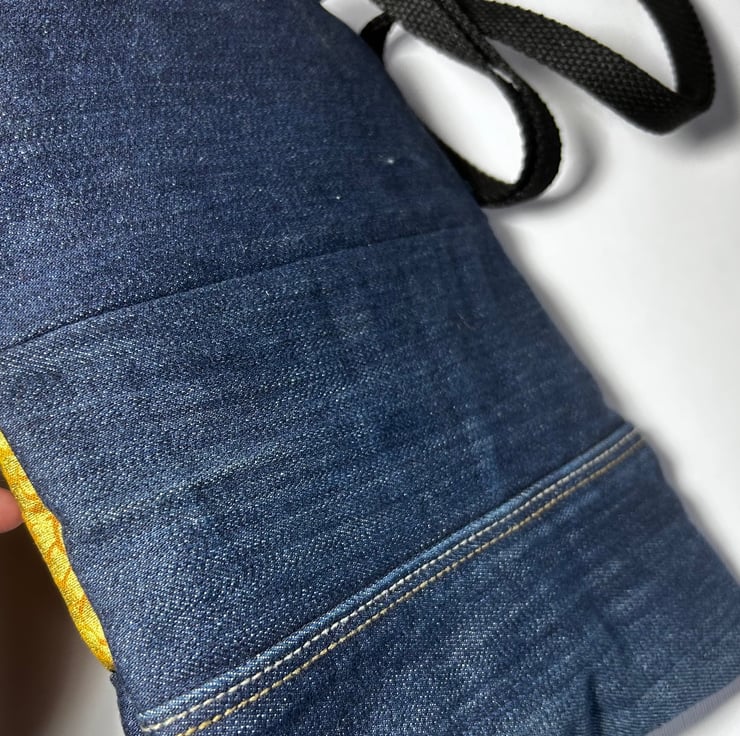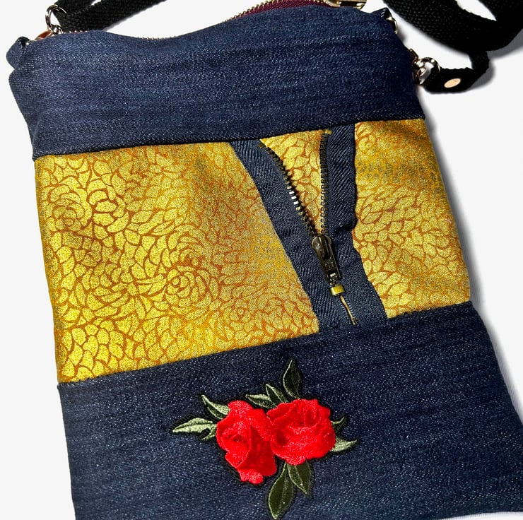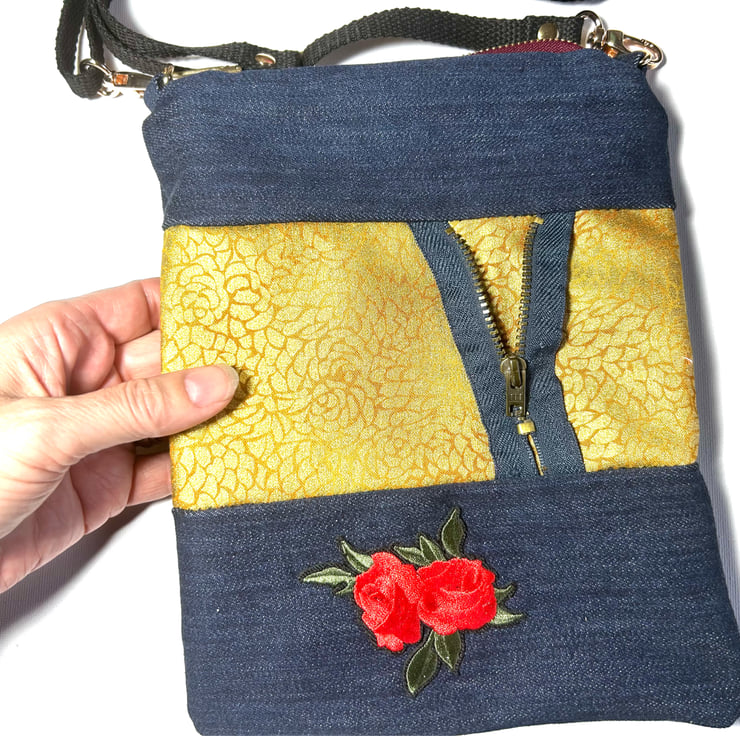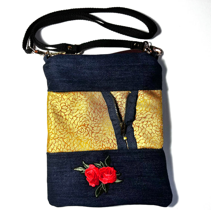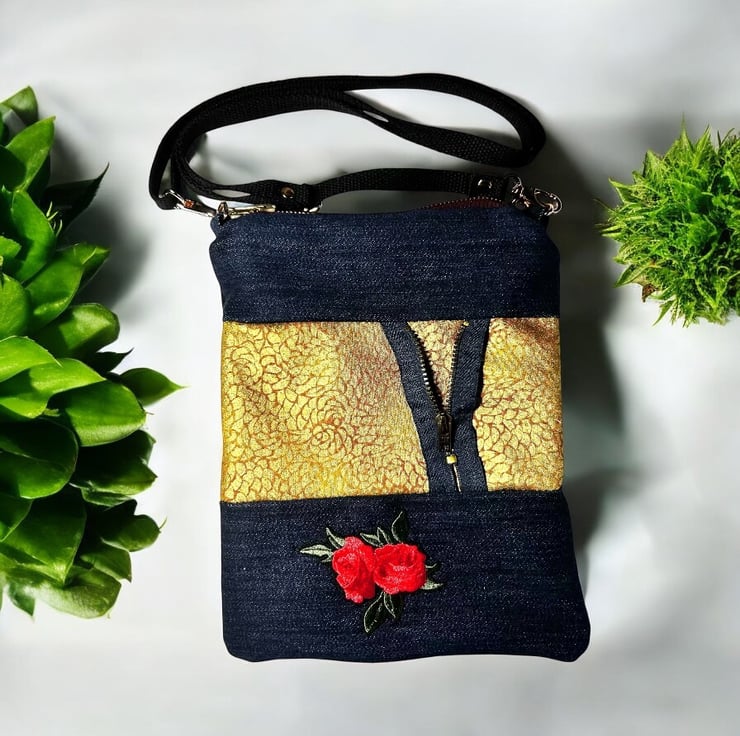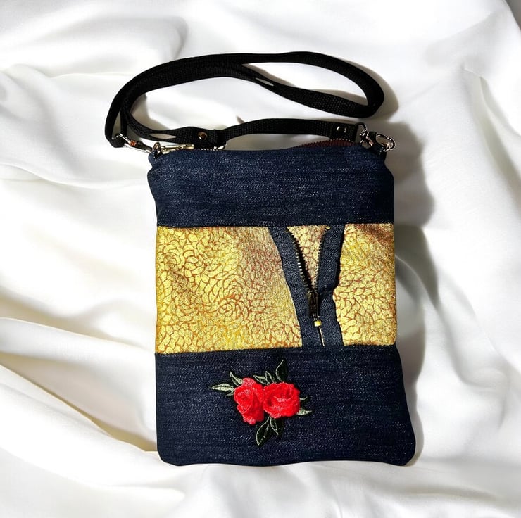 Handmade from up-cycled dark blue denim this bag has been made with a stylish contrasting gold fabric and zip detail to create a unique bag.