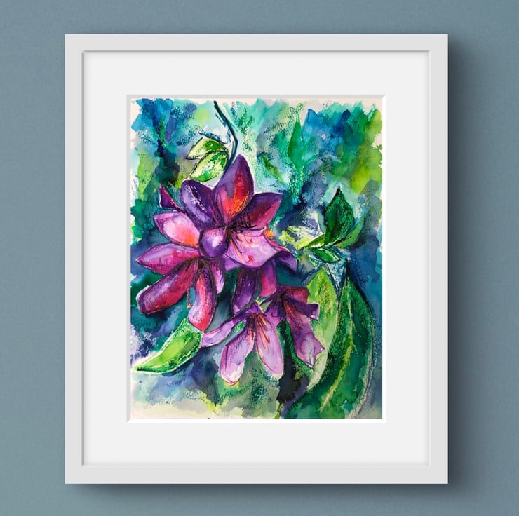 Mixed media watercolour painting on thick 300gsm Canson watercolour paper presented with a quality white card mount, ready to slot into a 14x11" frame.