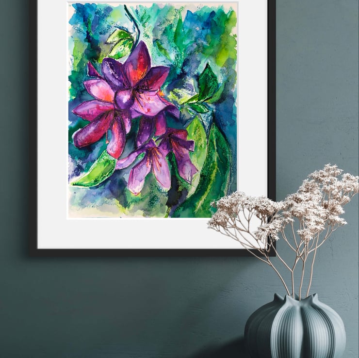 Rhododendron was inspired by the beautiful blooms seen out on a Summers walk around a magnificent National Trust garden. The vibrant flowers appear almost tropical against the lush green foliage.