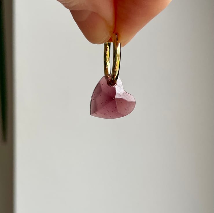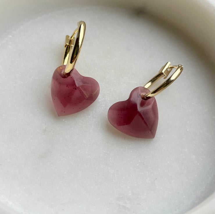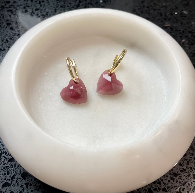 Gold-plated 14mm hoops with transluscent resin charm in a dark pinkish red. Lightweight and comfortable to wear. Sent by second-class post.