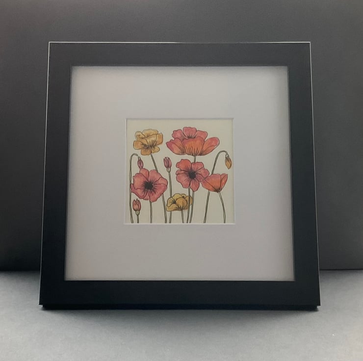 The picture is presented in a white card mount .The painting itself measures 10 x 10cms and the square black frame is 22.5 x 22.5cms .The frame can be hung or free standing ,whichever you choose The painting would make a lovely gift for a friend ,relative, thank you gift ,birthday ,or maybe someone who enjoys gardening .