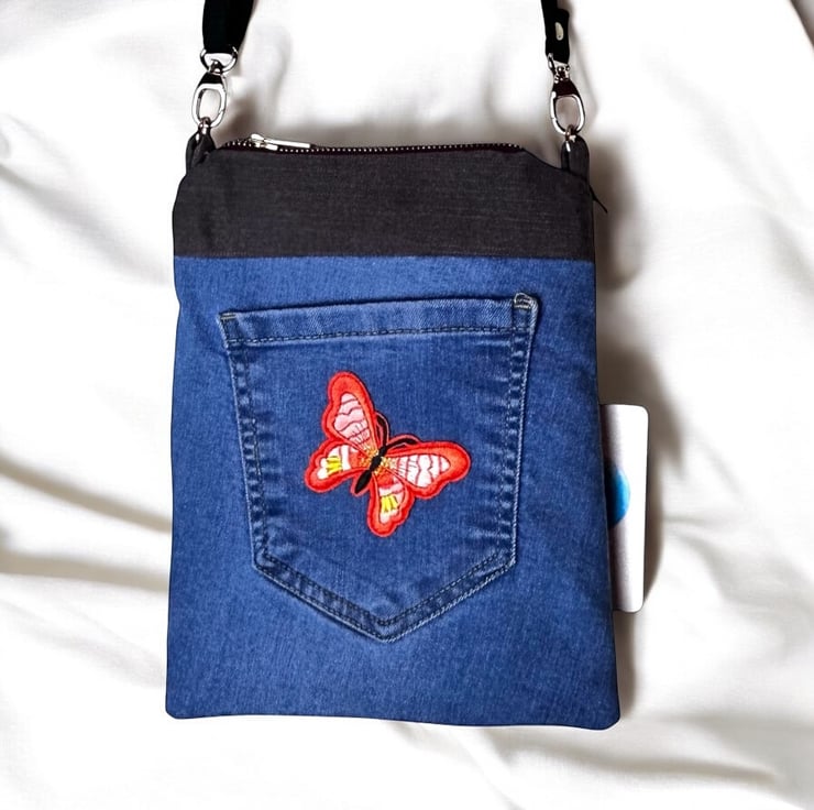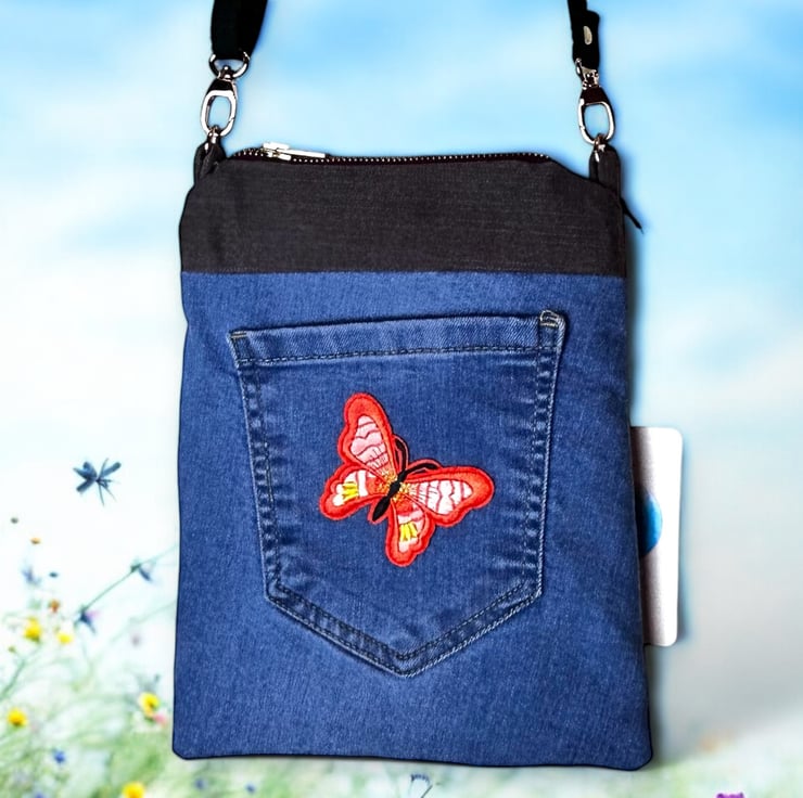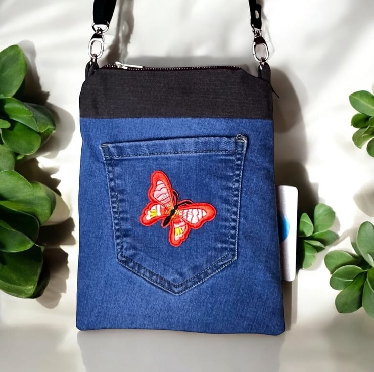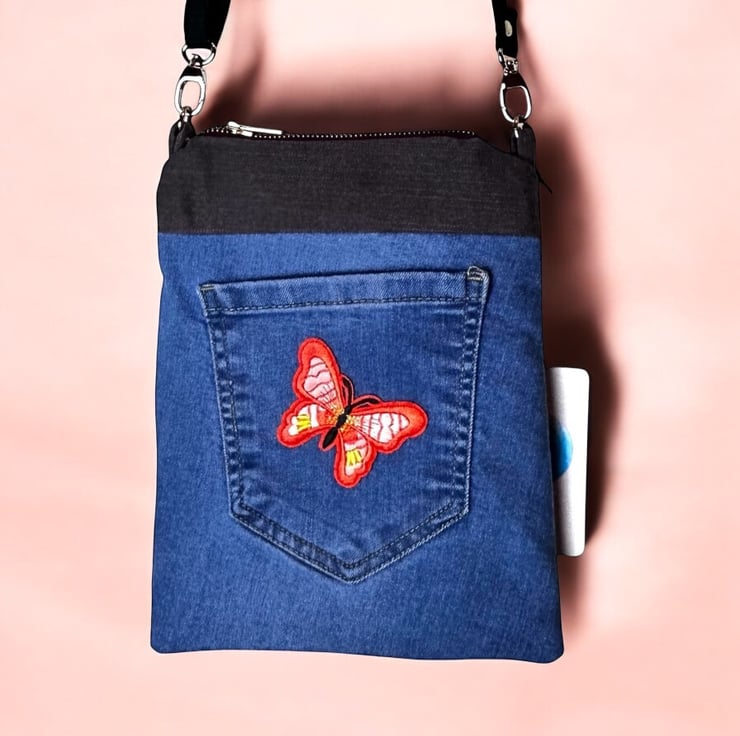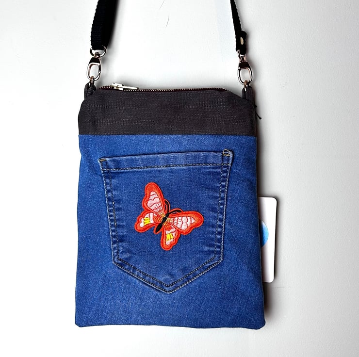Handmade crossbody bag made from upcycled brown and blue denim with zipped fastening and pretty butterfly detail.