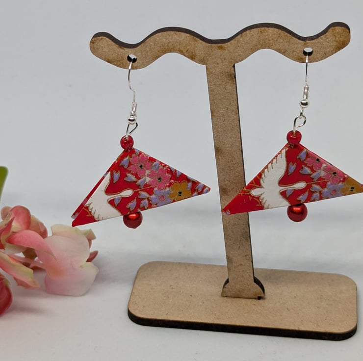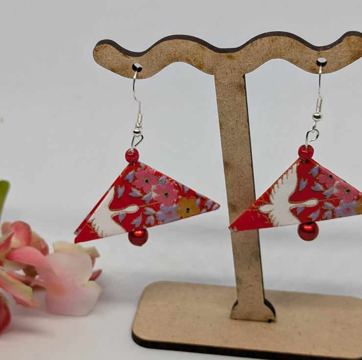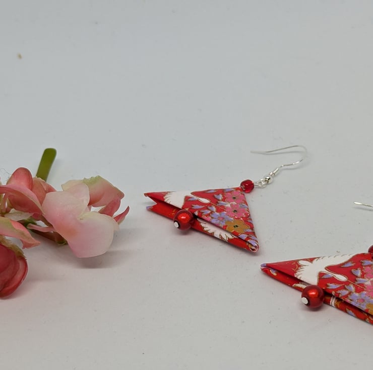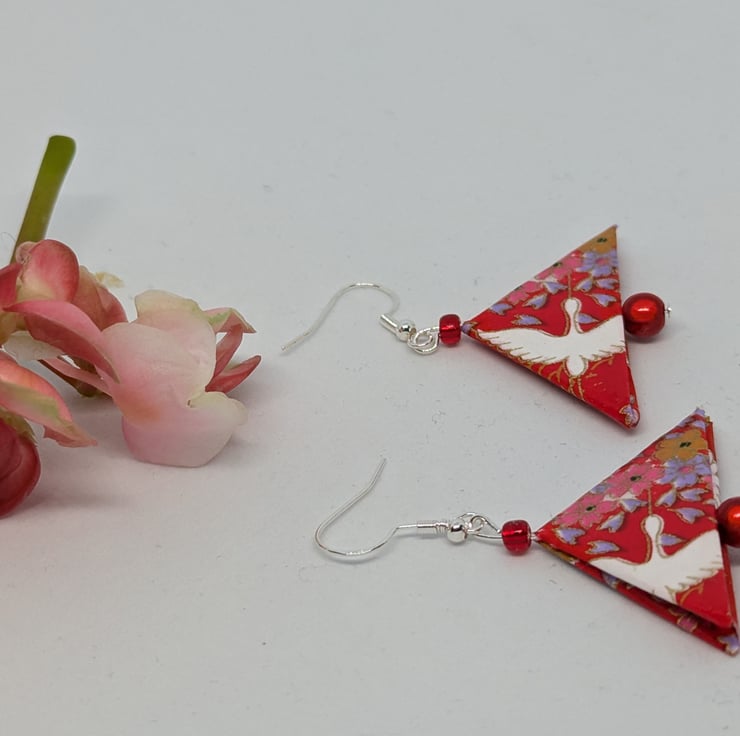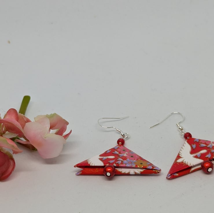 These unique earrings have been created with traditional Japanese washi paper with a traditional geese motif in white, pink, red and gold on a vibrant red background. The paper has been folded using origami techniques into a triangle shape. The earrings are enhanced with small red beads, and are 3cm in length, with sterling silver ear hooks. Hand crafted and designed in Glasgow, Scotland, these earrings would be a great addition to any collection. A perfect and unique choice for a first wedding anniversary gift!