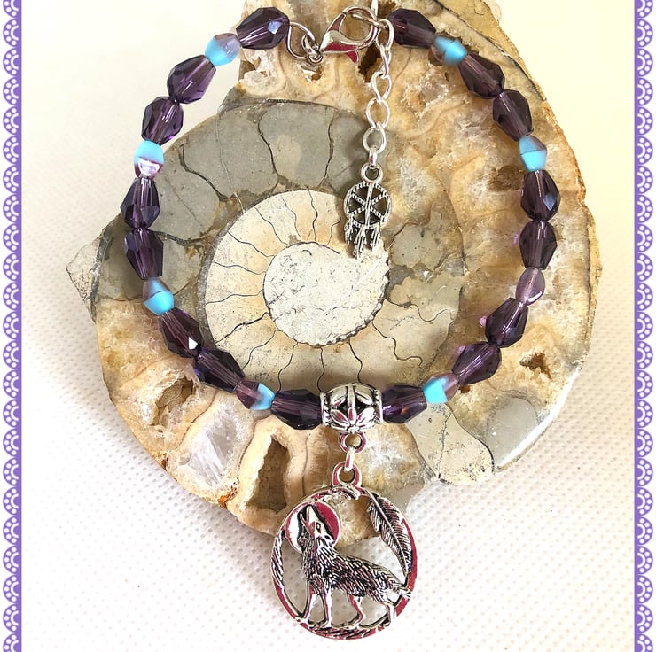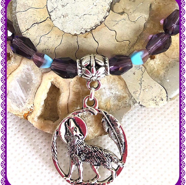 Created using this Tibetan silver howling wolf charm connected to a Tibetan silver connector , I’ve threaded purple faceted teardrop beads with two tone spacers onto stainless steel memory wire, lobster clasp & extension chain with a dream catcher charm. Adult wrist size. Nickel free.