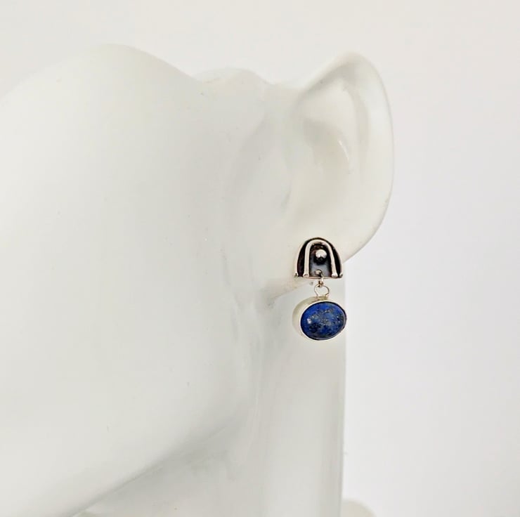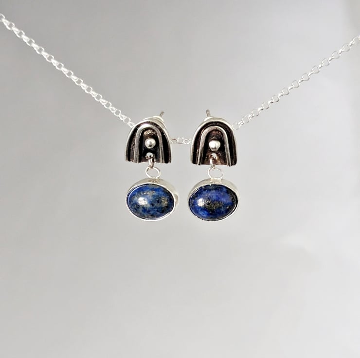 Lapis lazuli stones dangle from a stud earring with a fluid arch design inspired by the shapes and patterns of old celtic illustrations.