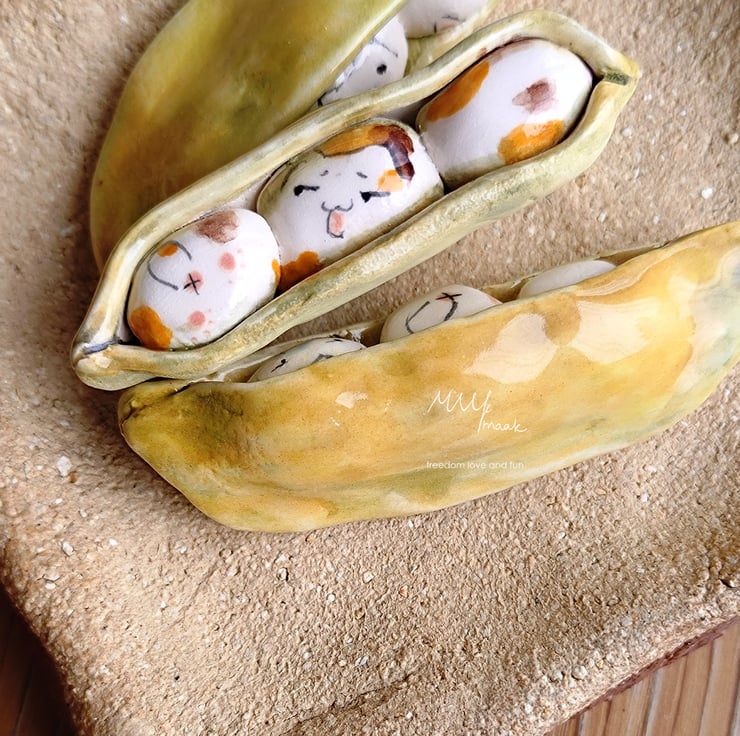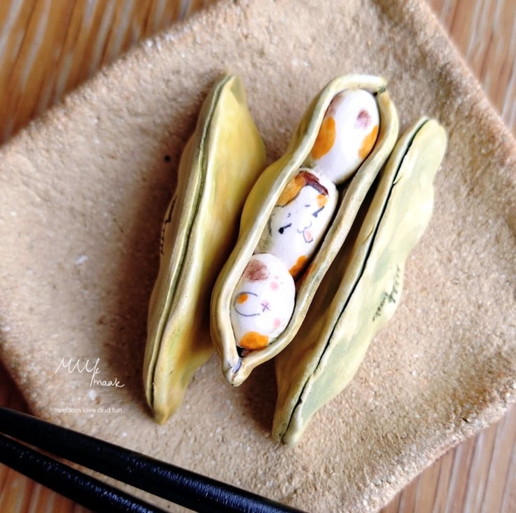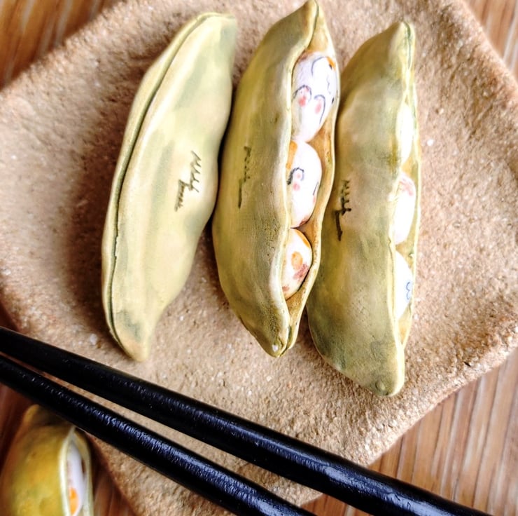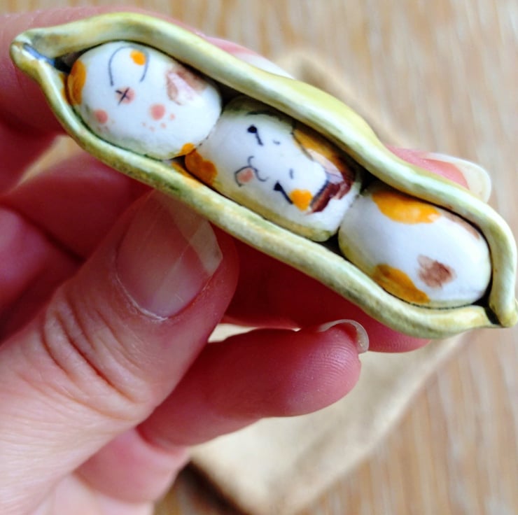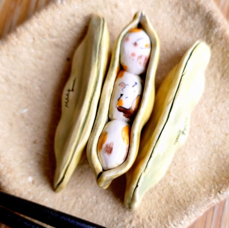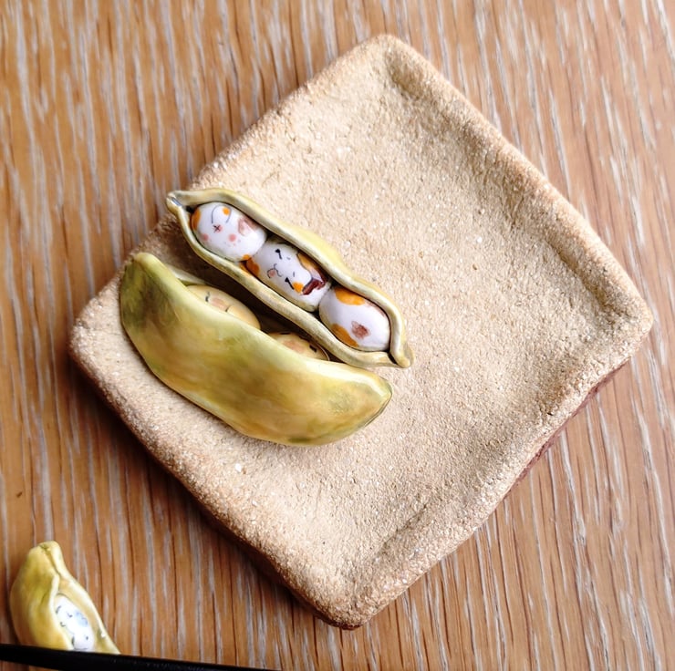Meet the Hanako family! The brood of kittens living in the Purrfect Pea chopstick rest. Isn't it a treat? It's made of ceramic, nice and sturdy, and it's just the thing for keeping your chopsticks clean when you're not using them. Plus, it's ever so cute, adds a bit of fun to your table, doesn't it? Perfect as a little gift too, if you're stuck for ideas. There you have a purrfect choice! We also offer saver set options, just brow through our shop and pick your purrfect pieces.