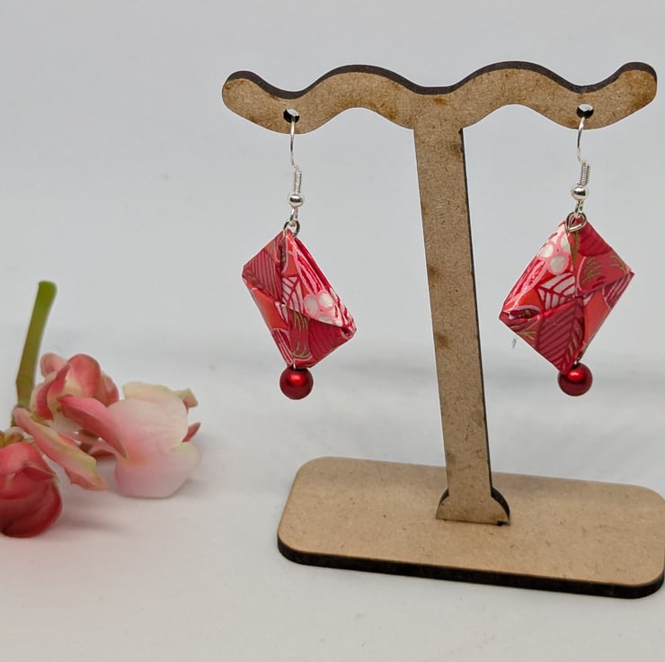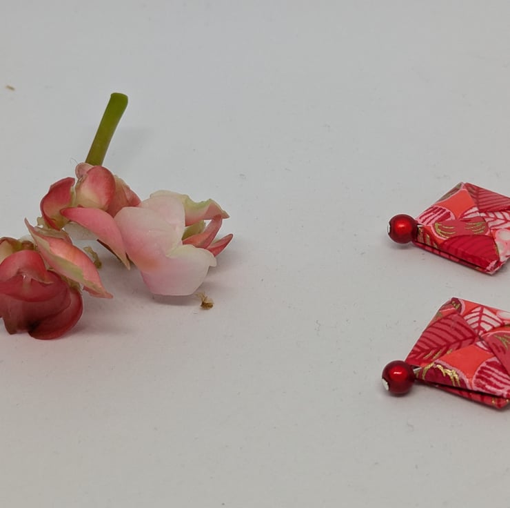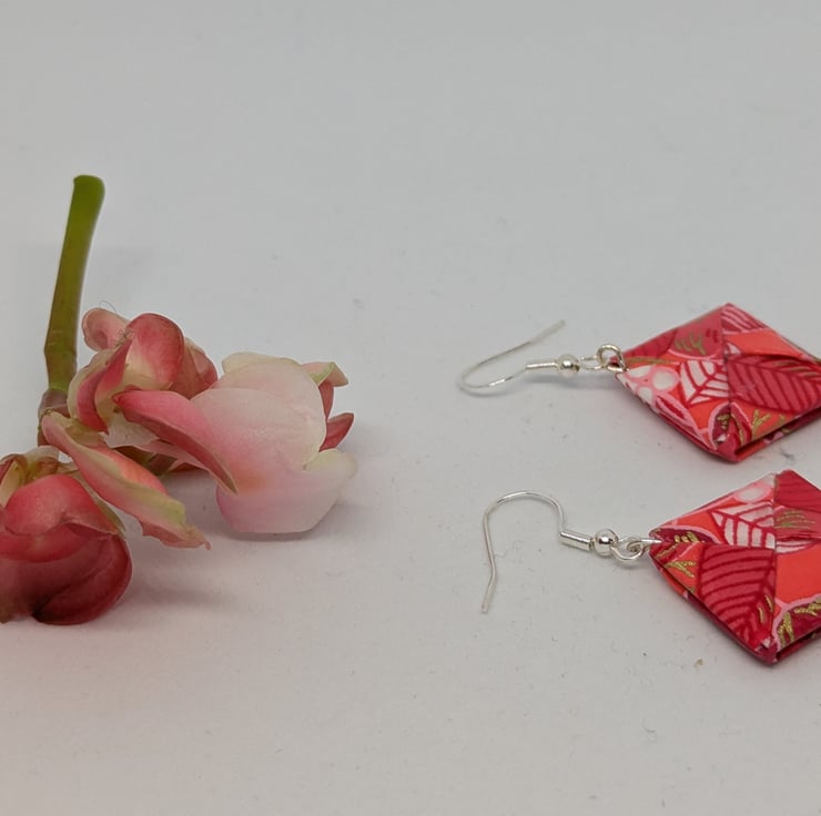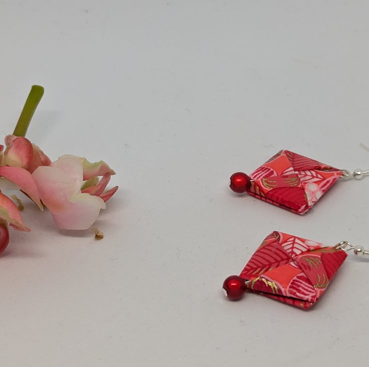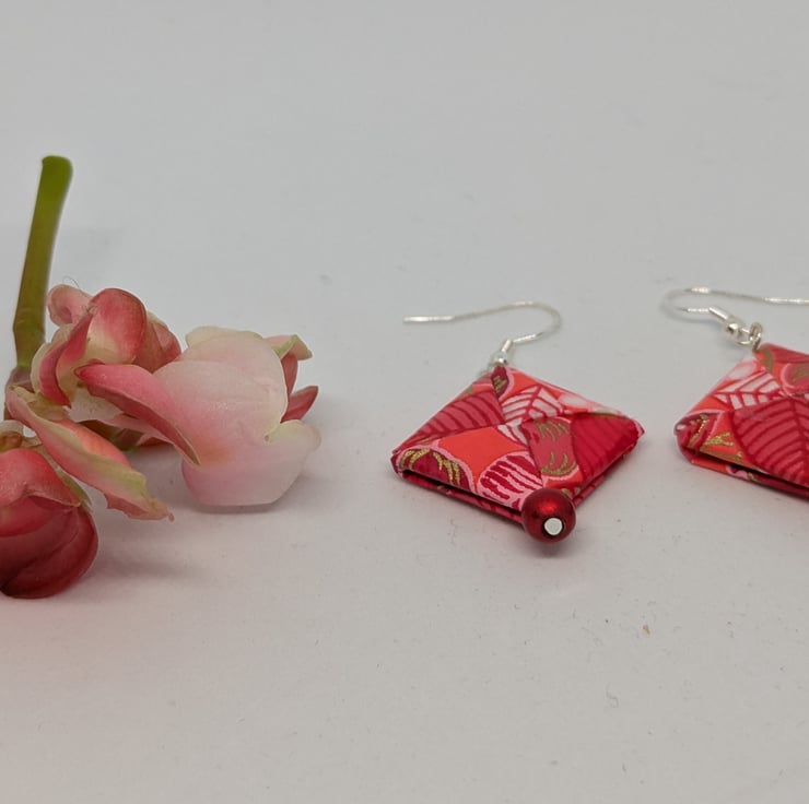 These unique earrings have been created with traditional Japanese washi paper with a beautiful pattern of flowers and leaves in shades of red and pink. The paper has been folded using origami techniques in a square shape. The earrings are enhanced with small red miracle beads and are 3cm in length, with sterling silver ear hooks. Hand crafted and designed in Glasgow, Scotland, these earrings would be a great addition to any collection. A perfect and unique choice for a first wedding anniversary gift!