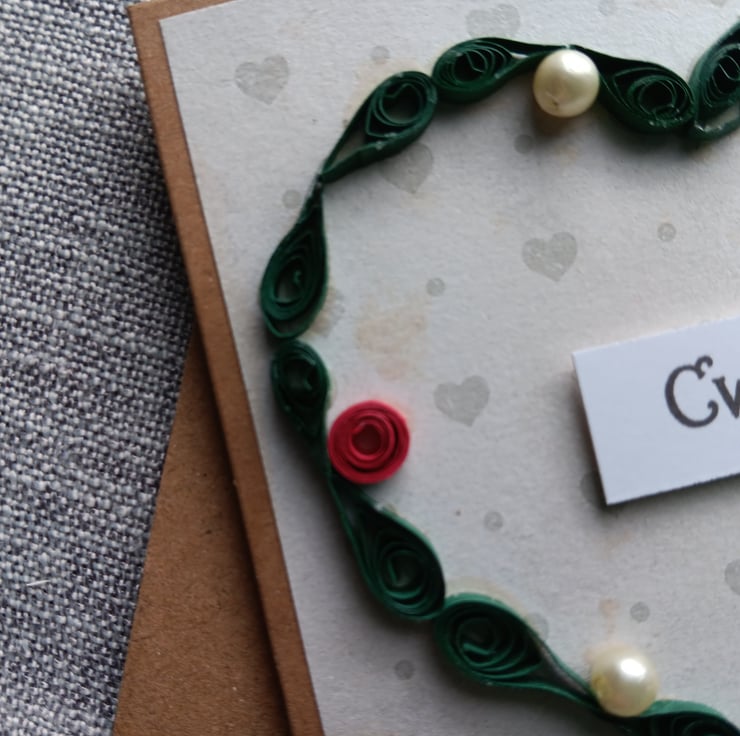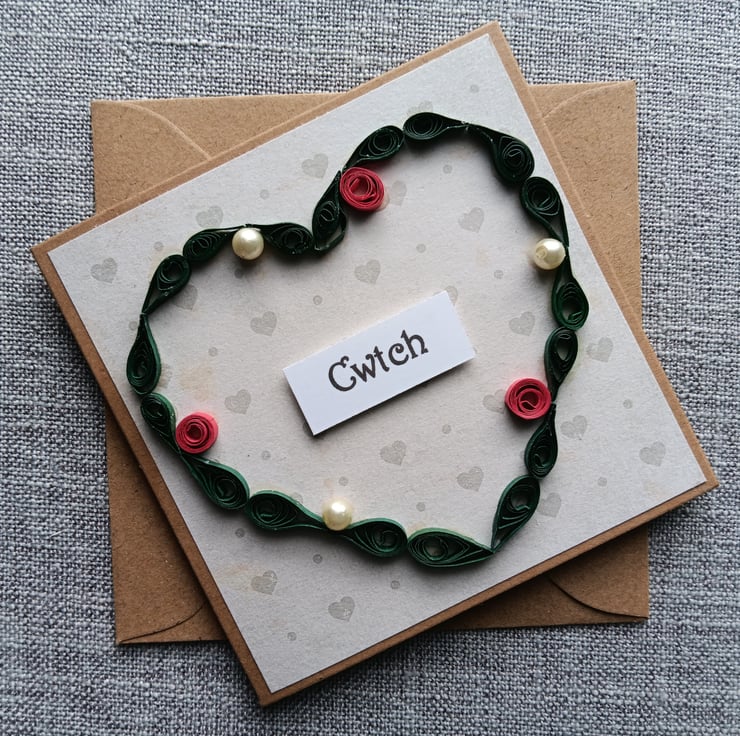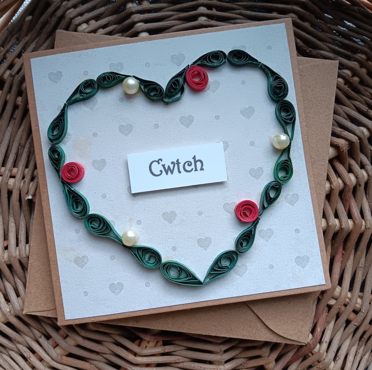 I learnt the art of quilling many years ago and have been perfecting it over the years. I like using quilling papers and other materials together and experimenting with new designs. All designs are my own. This particular card was inspired by my love of Wales and the word "Cwtch".