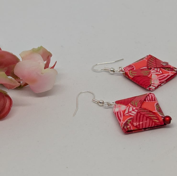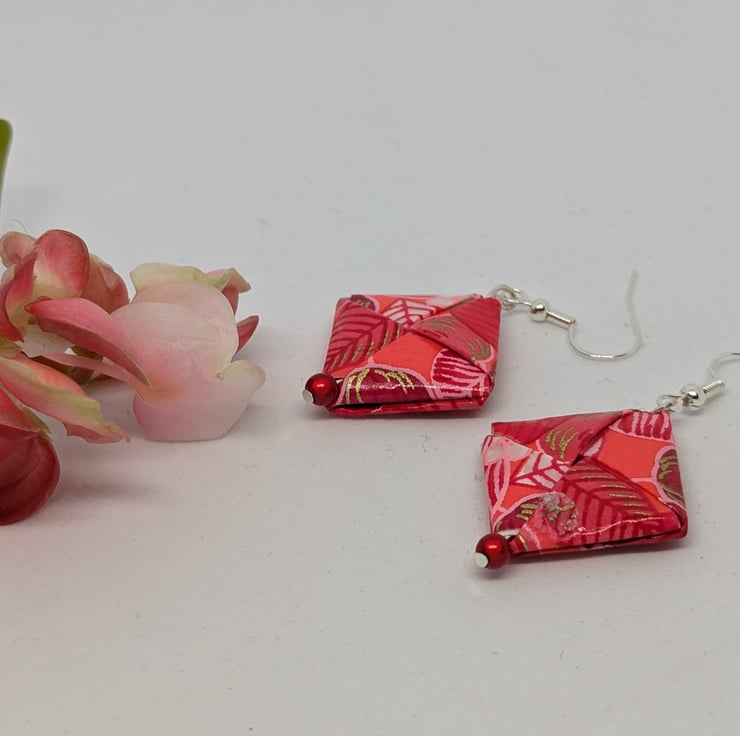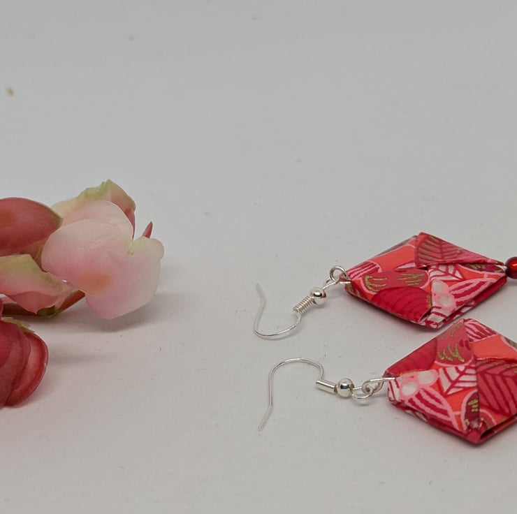 These unique earrings have been created with traditional Japanese washi paper with a beautiful pattern of flowers and leaves in shades of red and pink. The paper has been folded using origami techniques in a square shape. The earrings are enhanced with small red miracle beads and are 3cm in length, with sterling silver ear hooks. Hand crafted and designed in Glasgow, Scotland, these earrings would be a great addition to any collection. A perfect and unique choice for a first wedding anniversary gift!