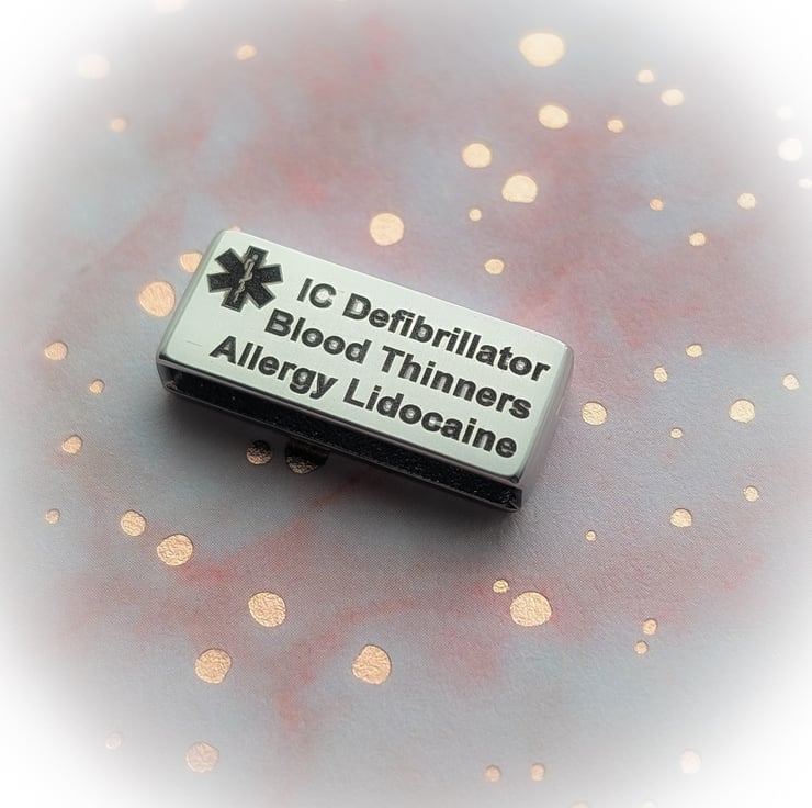 Medical alert charm engraved with your own vital medical information needed in an emergency. This can be medication, health conditions, your name, DOB, medical number, next of kin, blood type, emergency phone number and more.
