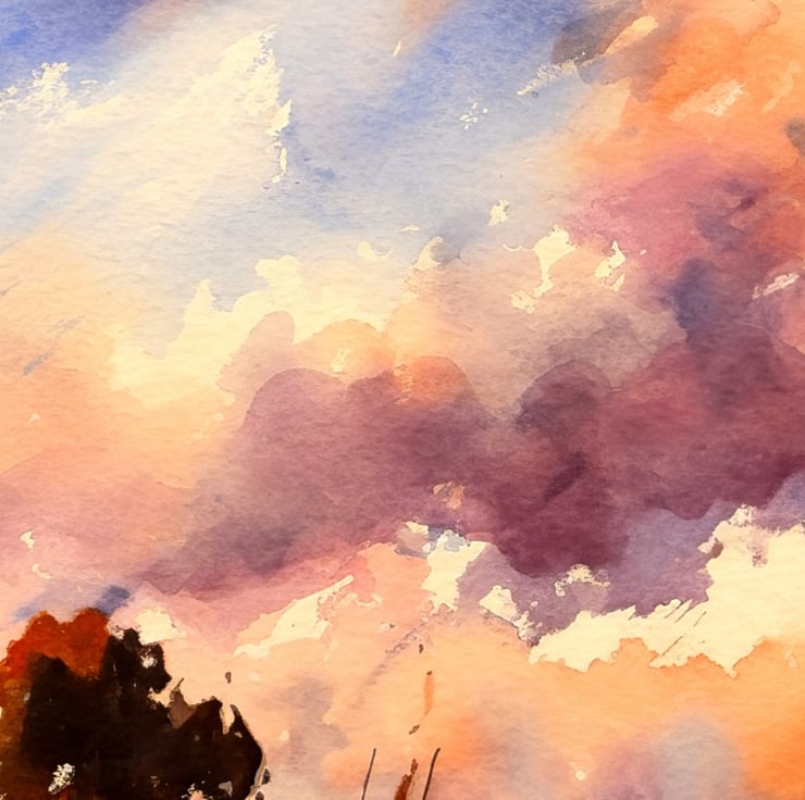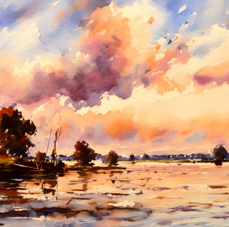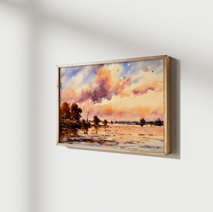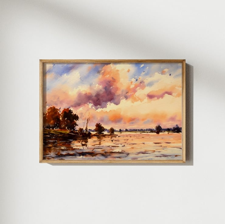 A tranquil river glows in warm golden light, reflecting a sky painted with soft oranges, purples, and deep blues. Meanwhile, expressive watercolor brushstrokes bring movement to the sky, blending the clouds into a dreamy, fluid composition.