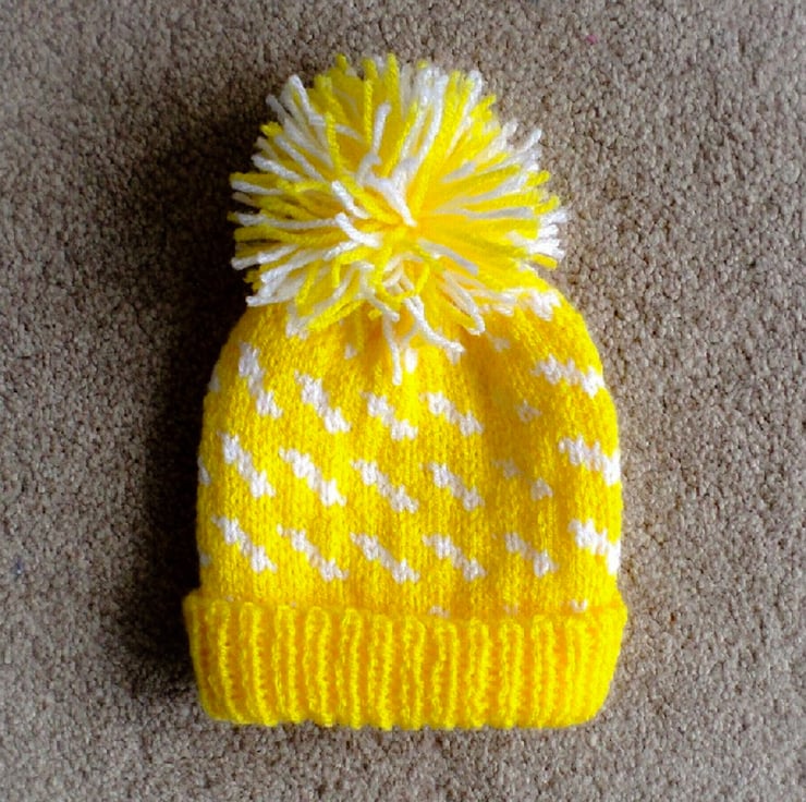 To fit: premature baby to 12 months. Width Round Head 15 (20: 25: 30: 34.5: 40) cm or 6 (8: 10: 12: 13.5: 16) inches. Hat is knitted in double knitting yarn using 3.25 mm and 4 mm knitting needles. The hat is flat and seamed.
