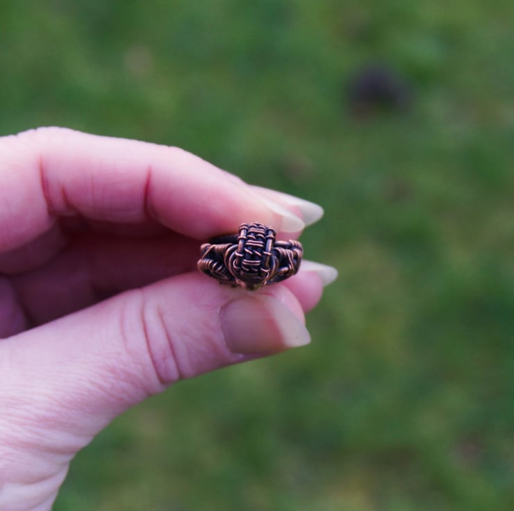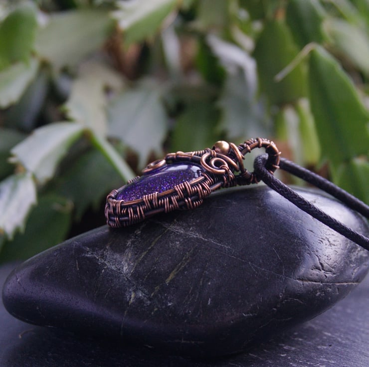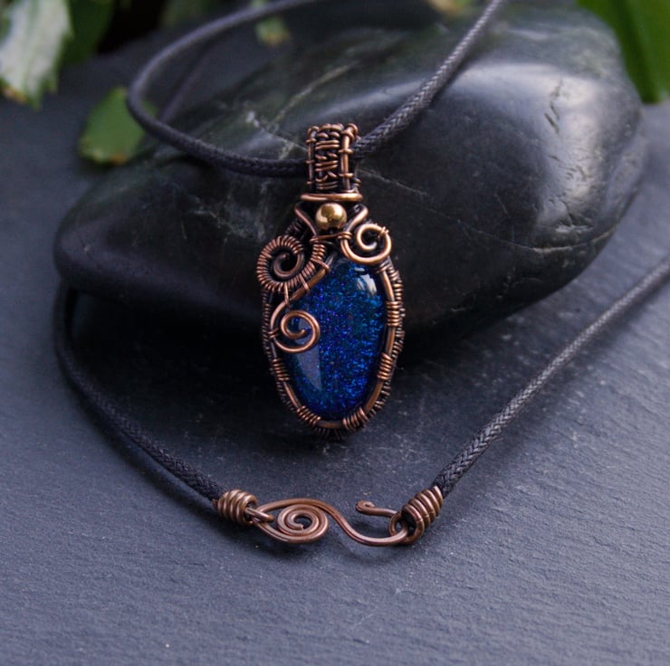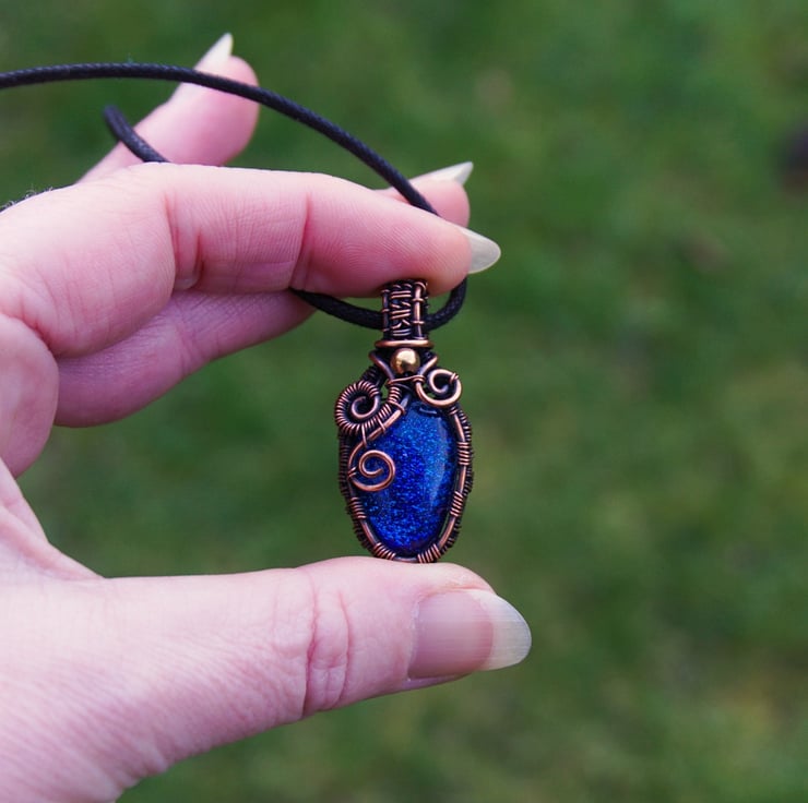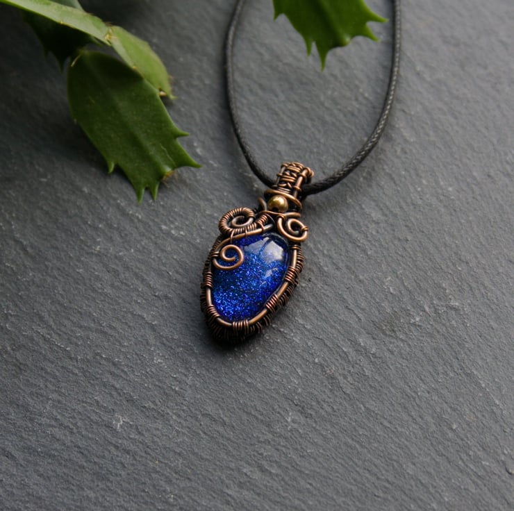 A small copper wire wrapped pendant, featuring a bright blue dichroic glass cabochon. A wire woven frame wraps the oval shaped glass, up to a narrow straight bail. Around the neck of the pendant are three asymmetric spirals, with a small copper bead in the centre.