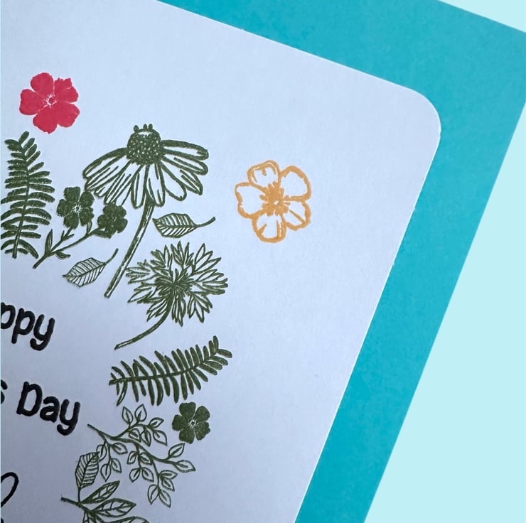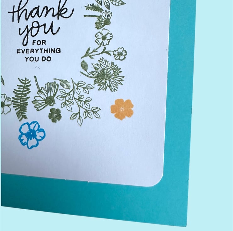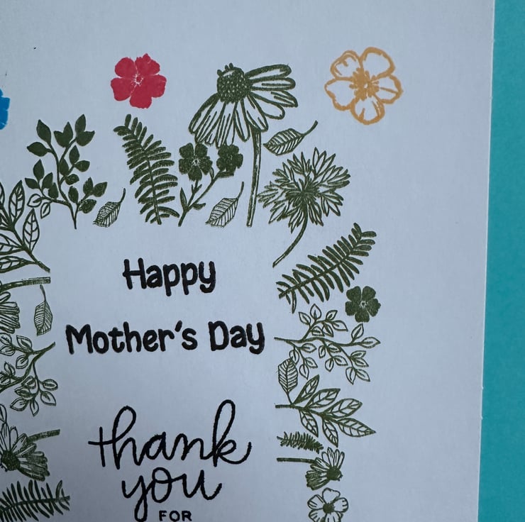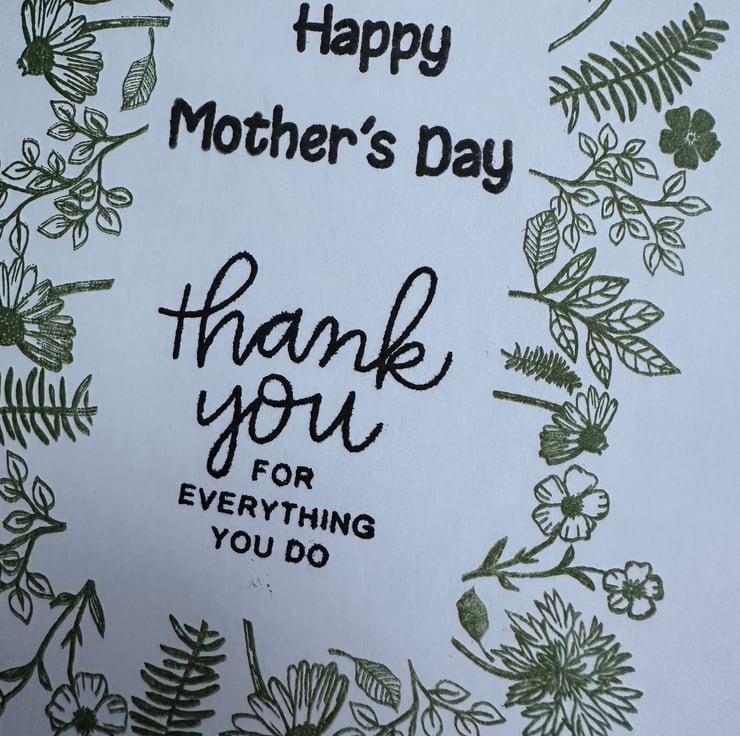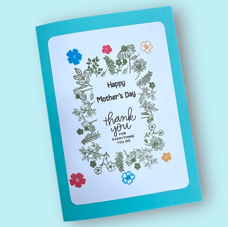 The greeting “Happy Mother’s Day, thank you for everything you do” is stamped in the centre with black archival ink.