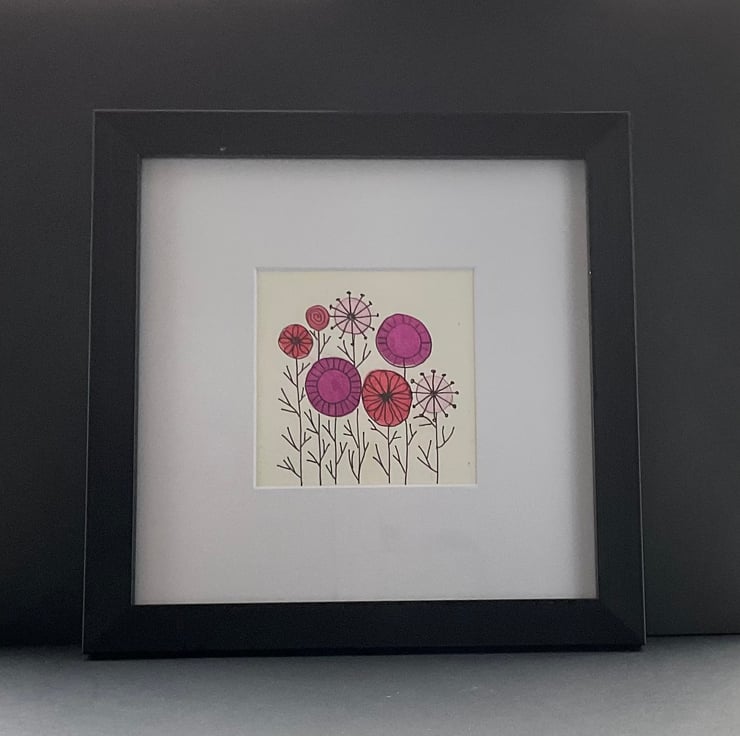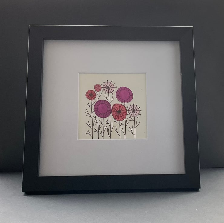 The picture is presented in a white card mount ,and the painting itself measures 10 x 10cms and the square black frame is 22.5 x 22.5cms .The frame can be hung or free standing ,whichever you choose The painting would make a lovely gift for a friend , relative ,or as a thank you gift , or maybe for a keen gardener .