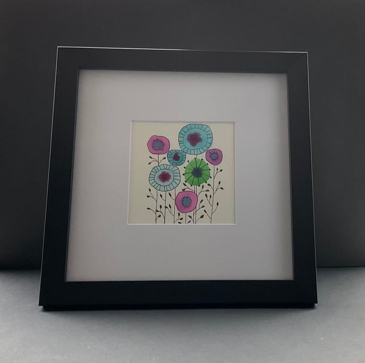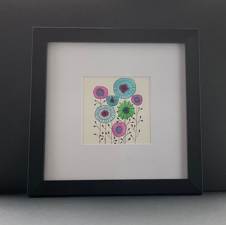 The picture is presented in a white card mount ,and the painting itself measures 10 x 10cms and the square black frame is 22.5 x 22.5cms .The frame can be hung or free standing ,whichever you choose The painting would make a lovely gift for a friend , relative ,or as a thank you gift , or maybe for a keen gardener .