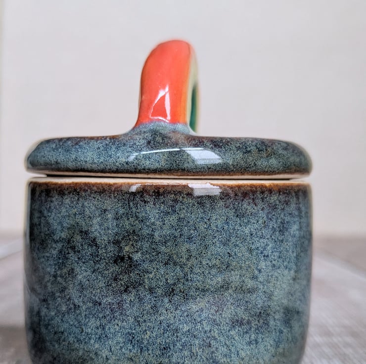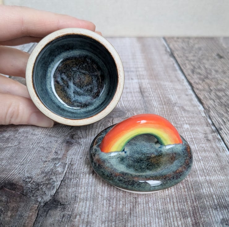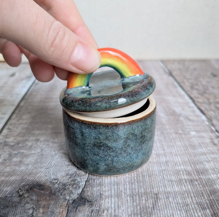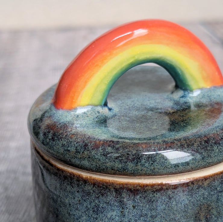 This small lidded pot is thrown on the pottery wheel from a white stoneware clay. A hand sculpted and hand painted rainbow sits on the lid to act as a handle. The pot is glazed with stormy blue colour, breaking brown over the edges.