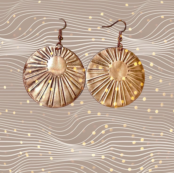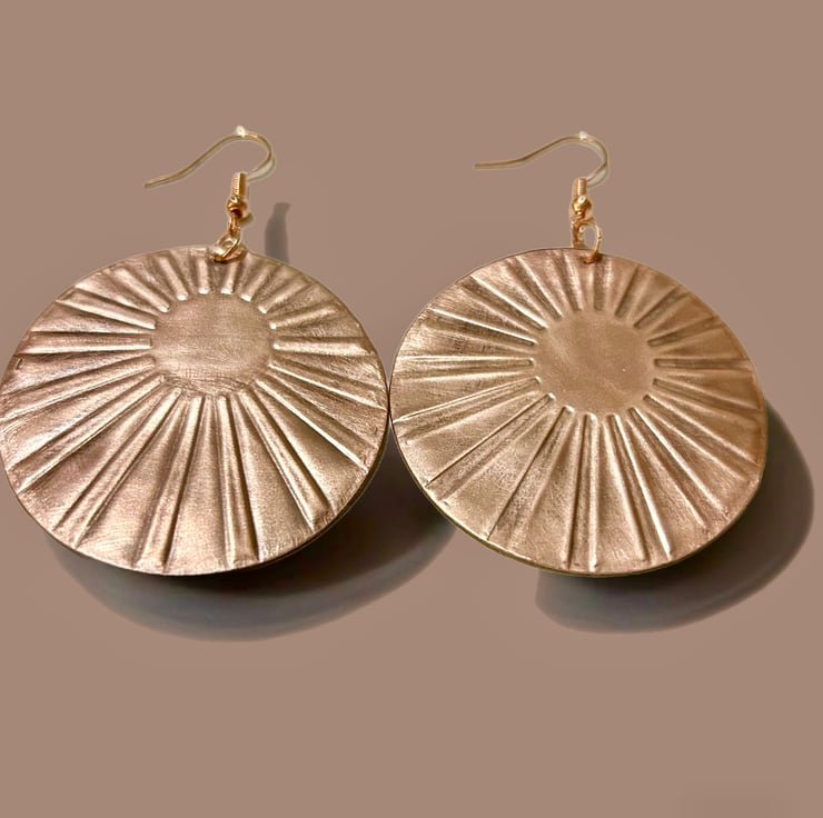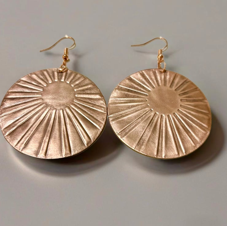 These beautiful earrings are vibrant and extremely eye catching. The oxidisation has been polished to highlight the embossed sun rays and will compliment any outfit. Drop is approx 1.5”.