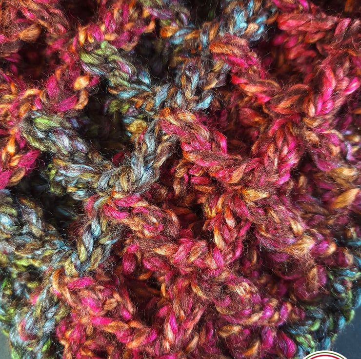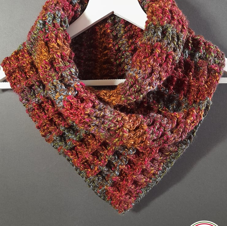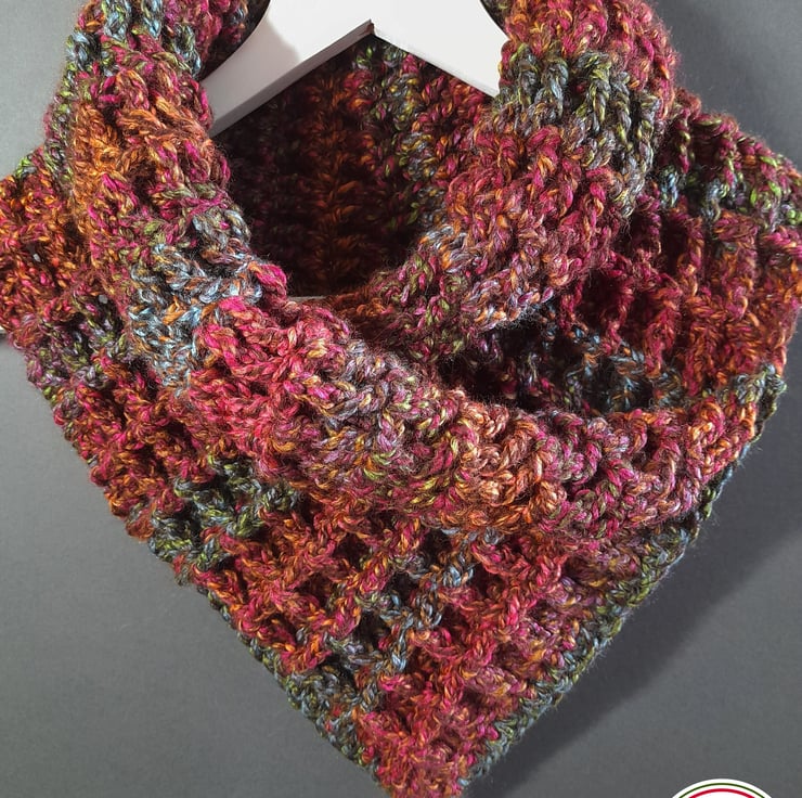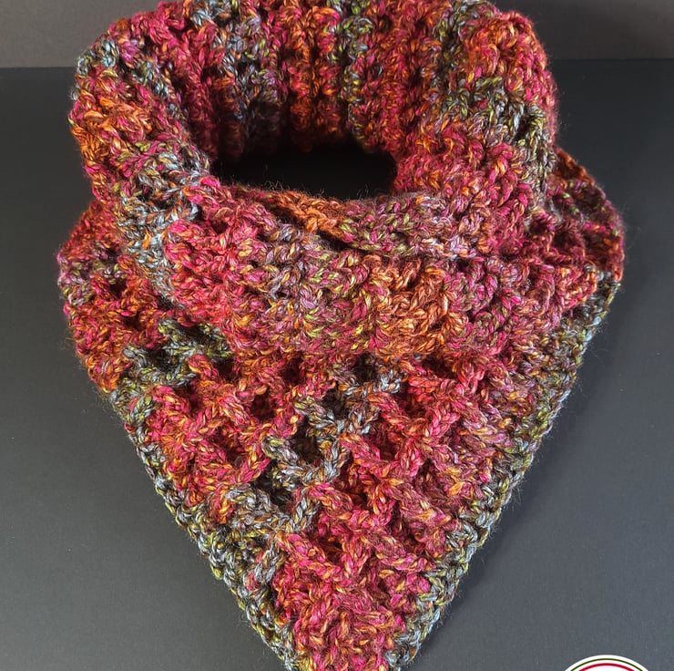 I chose a soft chunky yarn for this cosy neck warmer and I used a crochet waffle stitch to give the attractive 3D structure. The stitch is so effective with the chunky yarn- making the neck warmer very tactile and nice to touch