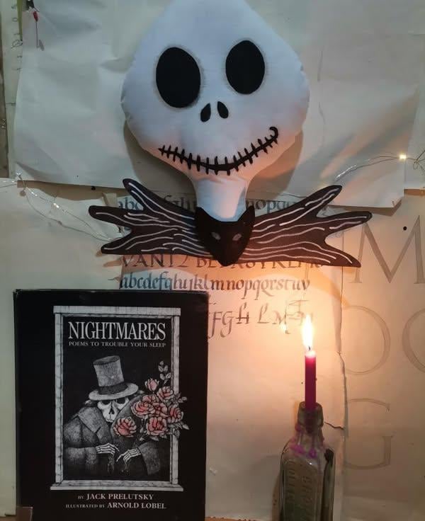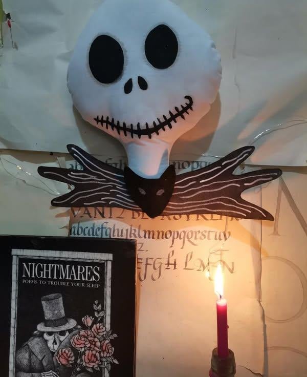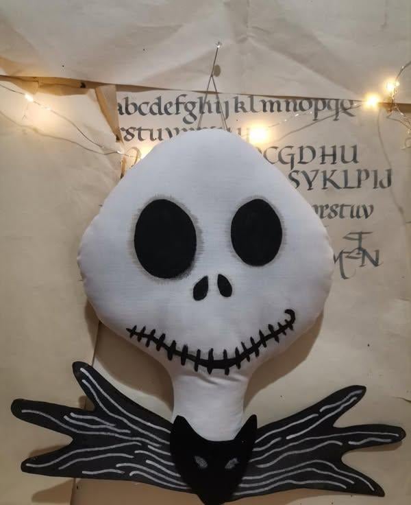 A textile art wall hanging based on Jack Skellington from Nightmare before Christmas