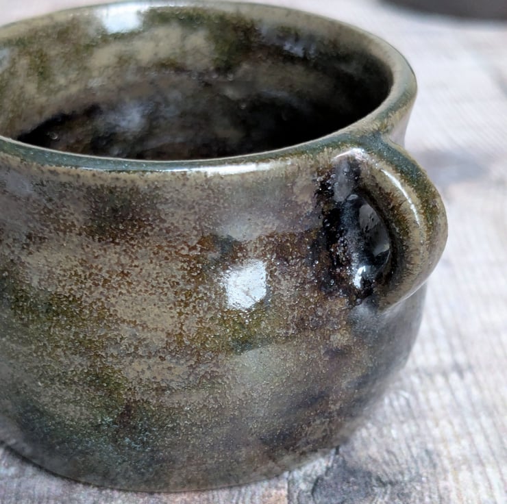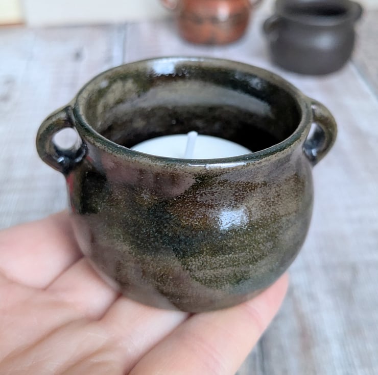 A small ceramic tealight holder, wheel thrown from black stoneware clay. There is a small handle on either side, beware these may get hot. The glaze almost has a metallic appearance whilst still black.