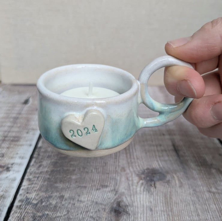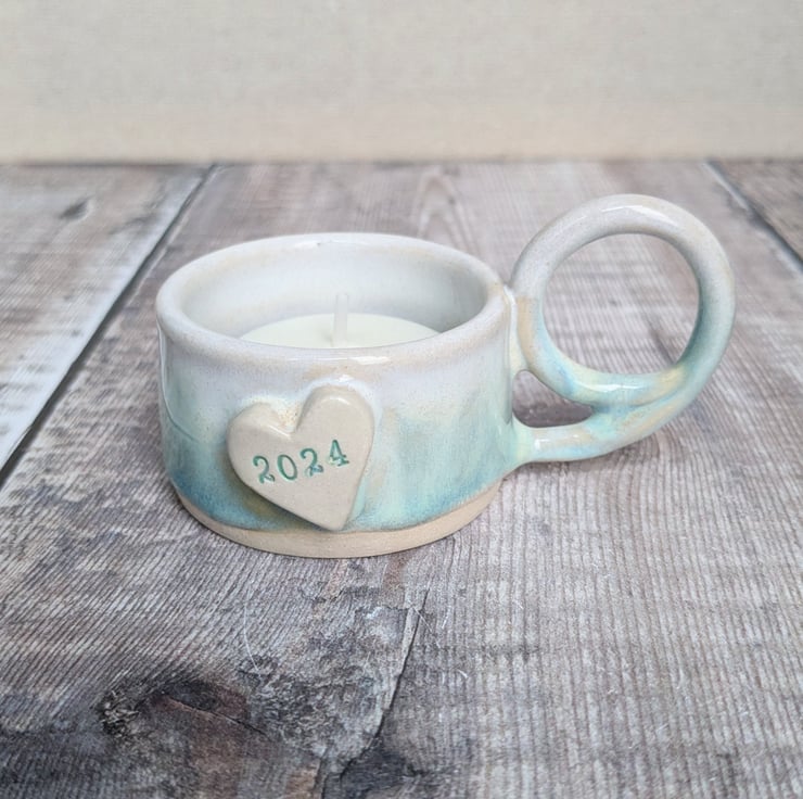 A ceramic tealight holder, wheel thrown in a white stoneware clay. A hand built handle is added on one side. The glaze is a lovely tonal white flowing into turquoise near the base. A heart is on the front, embossed with '2024'.