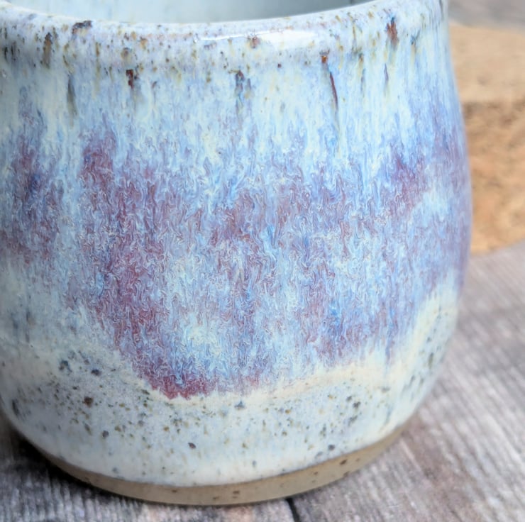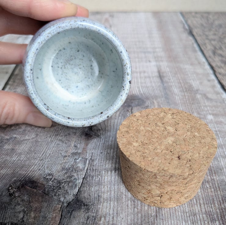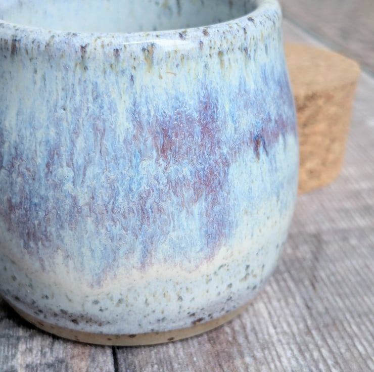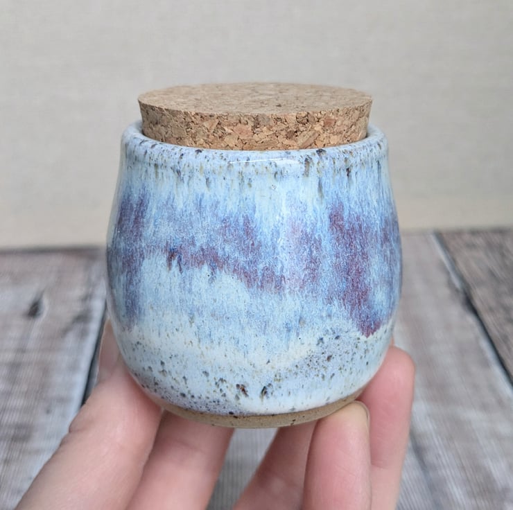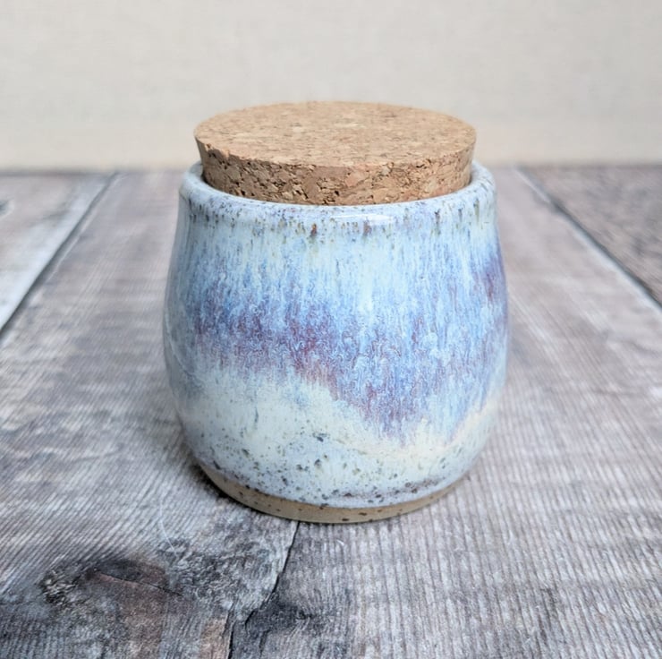 This pot is thrown from a speckled stoneware clay on the pottery wheel. There is a lovely tonal white glaze all over with blue and purple shades added on the outside. A quality cork lid is supplied.