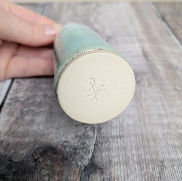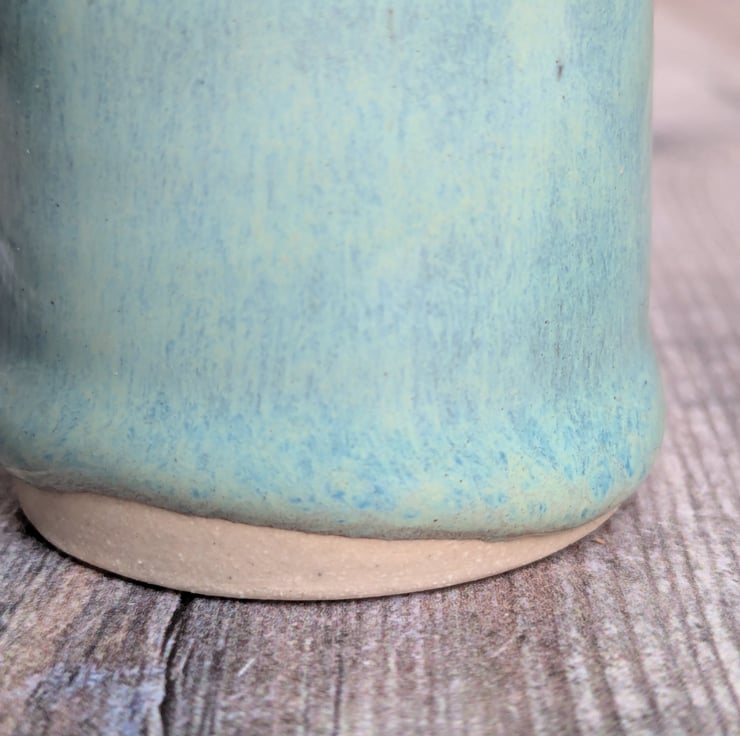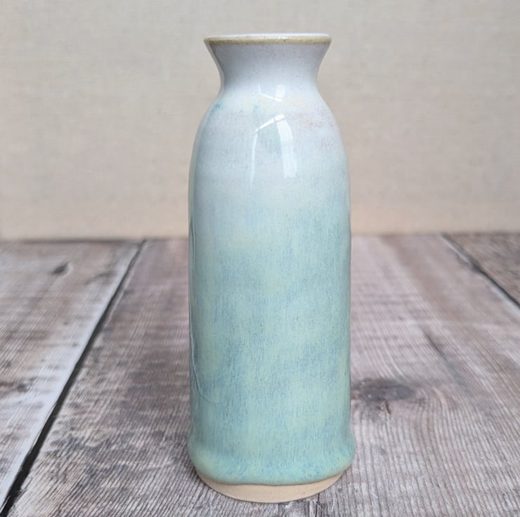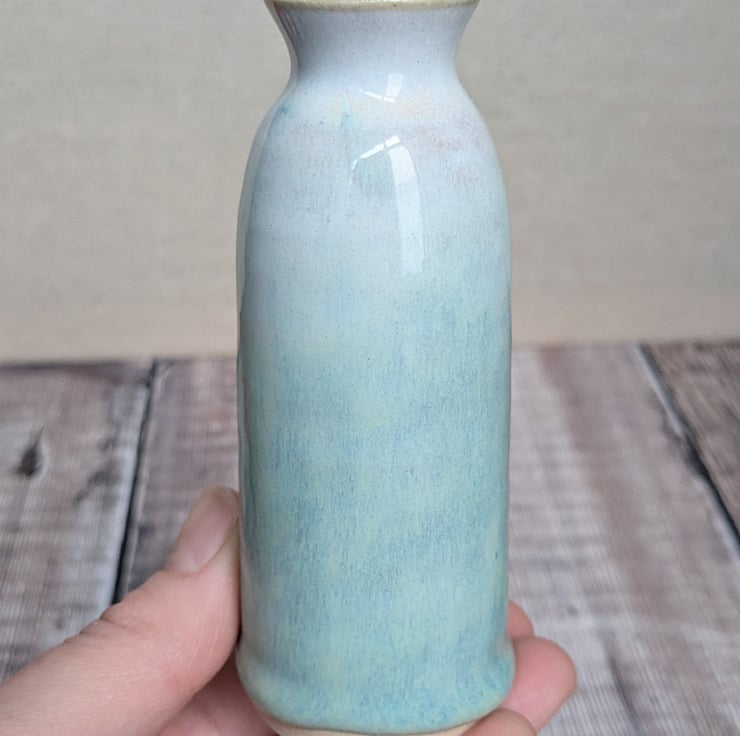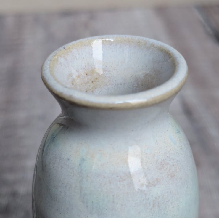 A small ceramic vase, wheel thrown in a white stoneware clay. The glaze is a lovely off white flowing into turquoise towards the base. The height is about 10cm, the neck is tapered at 1.3 to 2.2cm.