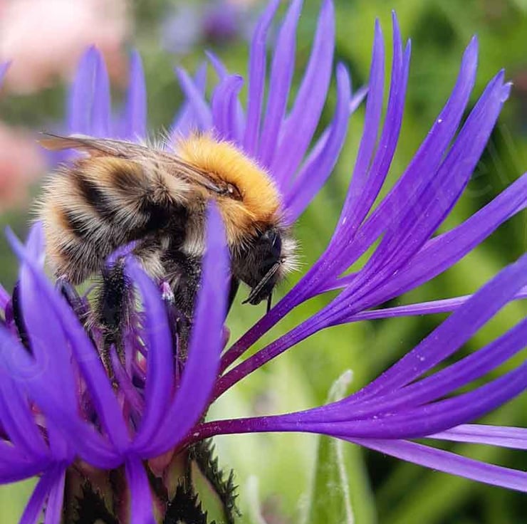 A bumblebee pauses for a snack on a violet mountain cornflower. A lovely summer scene, and a great gift for a gardener or naturalist.