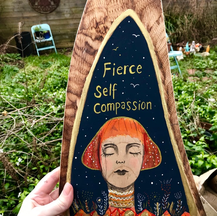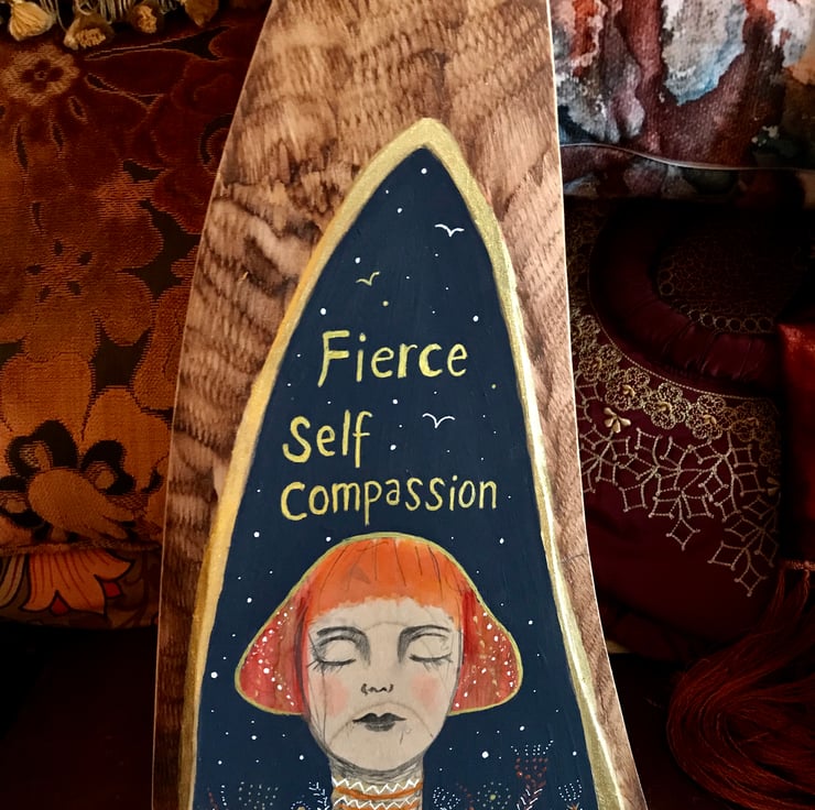 Painted wood piece, "Fierce self compassion", comes with display stand xxx