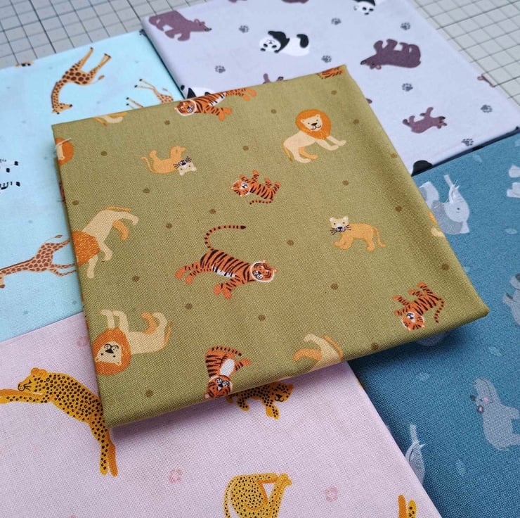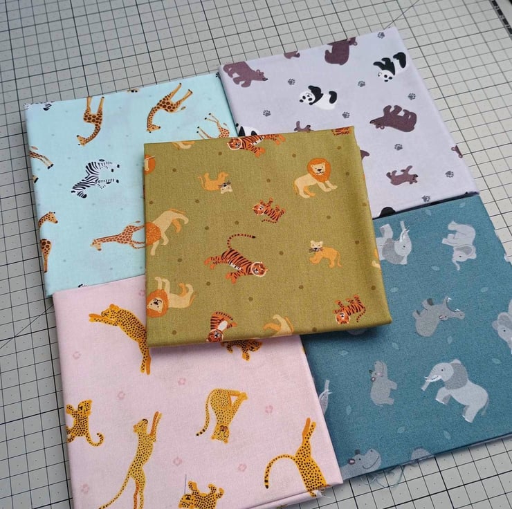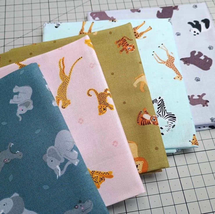There are 5 fat quarters in the bundle, each having different jungle or safari animals on a different colour.