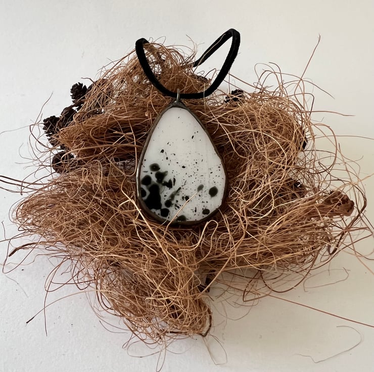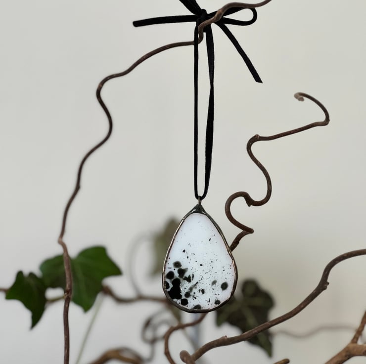 A beautifully speckled white stained glass mini egg decoration for spring or Easter. Finished with a deep charcoal black patina and a black velvet ribbon, this mini egg fits in with bright and cheery or more subtle and sophisticated spring interiors.