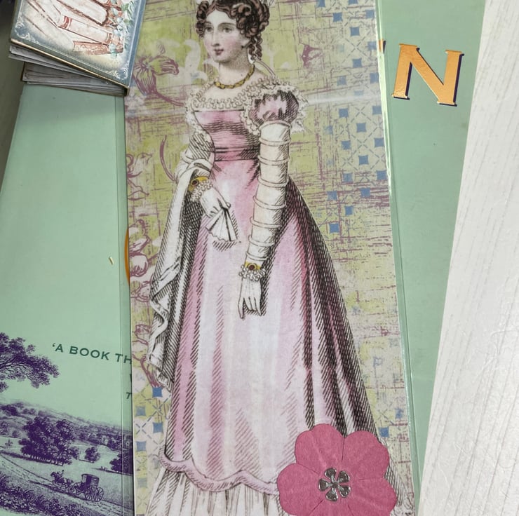 Laminated bookmark with a lady of the Jane era. Flower in the corner, with a lace print backing. Lilac tassel, 4 glass beads, ‘J’ initial charm and a mini book.