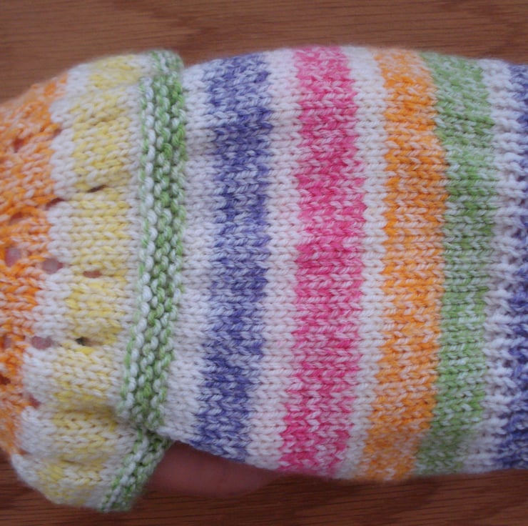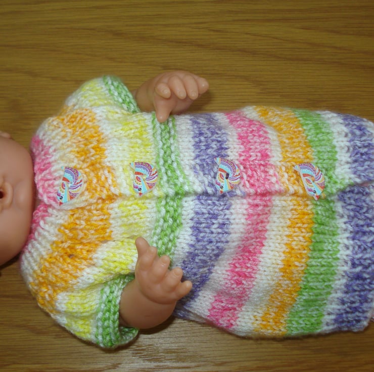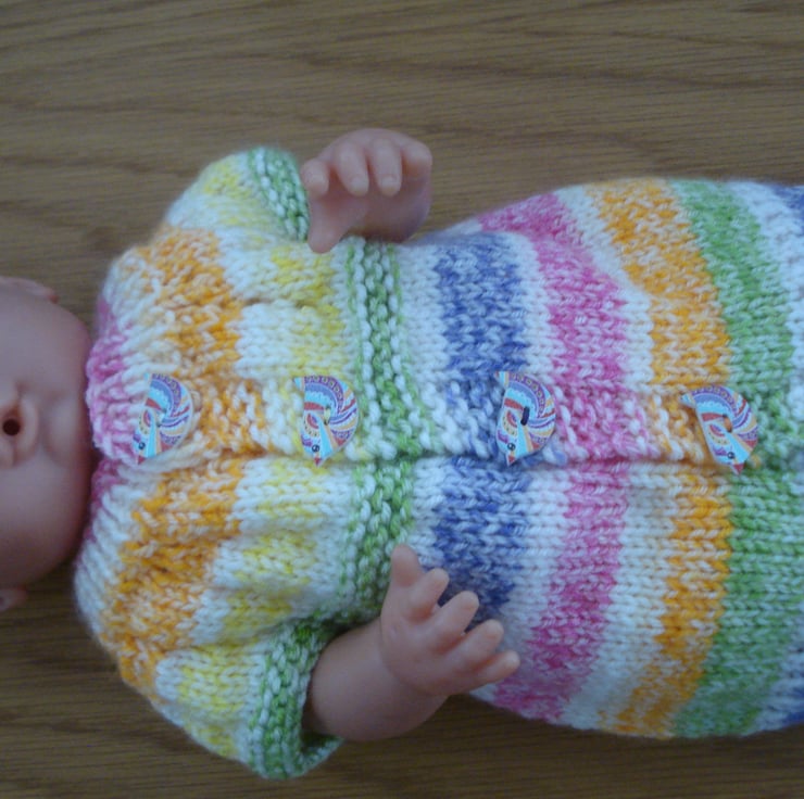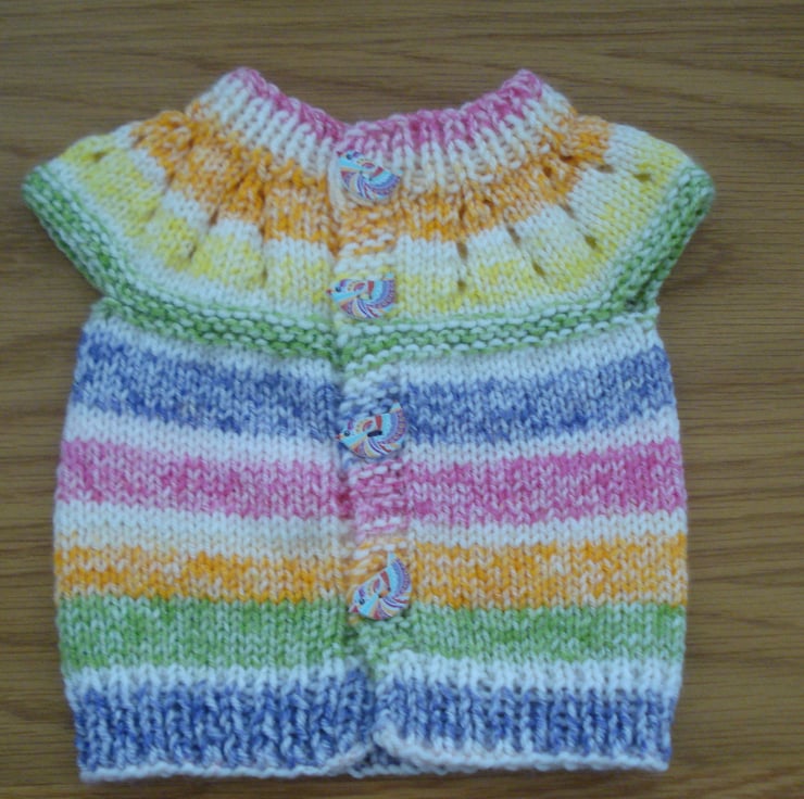 This is a hand knitted dolls cardigan knitted in multi coloured yarn and it has four pretty buttons in the shape of birds. It is 20cm long and chest size is 34cm. The photos show it on a 15" doll it would probably fit up to an 18" doll. Please note doll or other clothing not included.