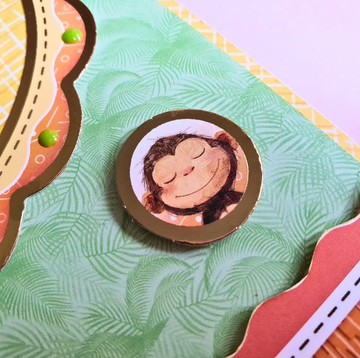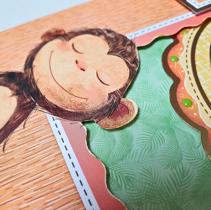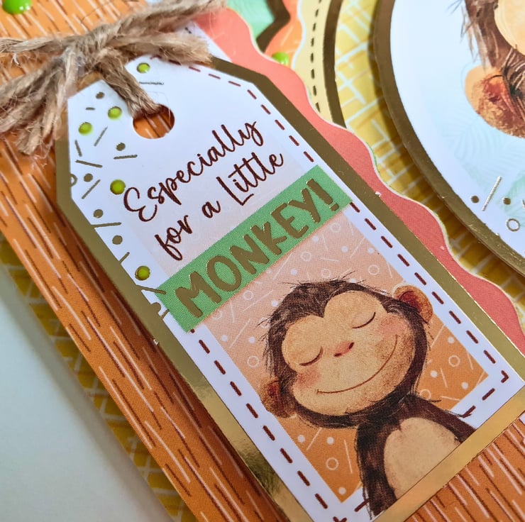 The large monkey topper with the gold foiled border lays on a light green card with a jungle tree pattern. On the left side, there is a raised, fussy-cut "L" shaped decorative panel with a wood pattern and a monkey in the corner. The sentiment tag reads "Especially For A Little Monkey" & is decorated with a bow made of natural twine. A smaller button tag with the same monkey face is on the bottom right of the main topper. The card is embellished with colour drop accents in apple green colour & it is finished with a matching insert that has been stamped with the sentiment "It's Your Birthday" in brown, still leaving you plenty of space for messages and wishes!