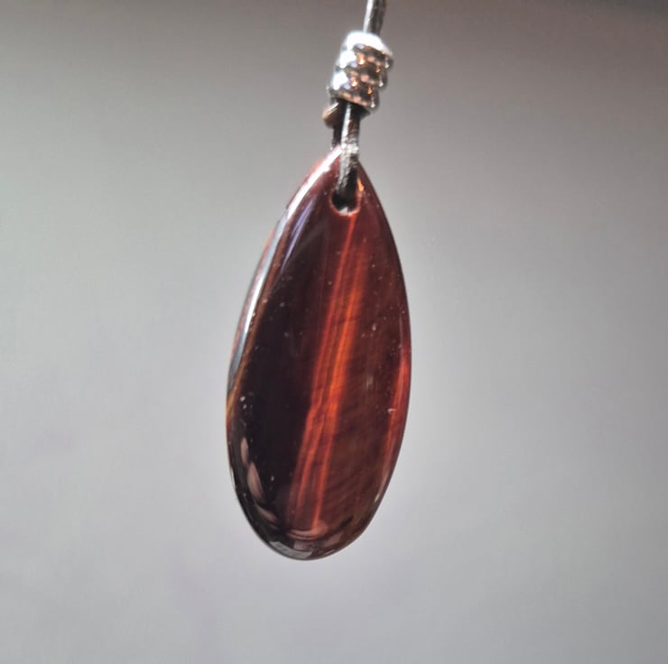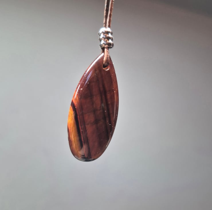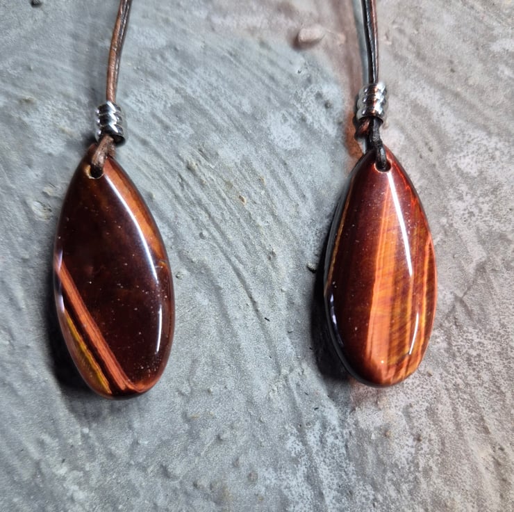 Red Tiger iron Teardrop Pendants on Gypsy Sippa leather cord with stainless steel connector and slider.