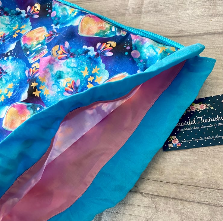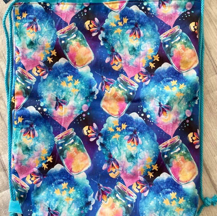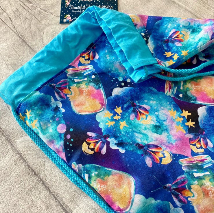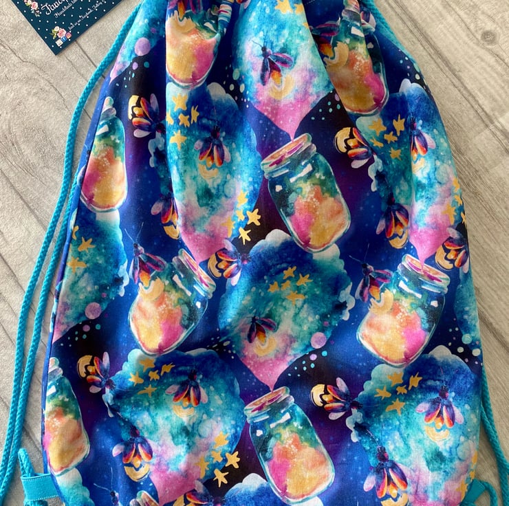 Child’s drawstring backpack in this beautiful fairy jar themed fabric. This lovely fabric is 100% cotton so feels great. I’ve lined it with a water resistant rip stop fabric making it perfect for school trips, days out, pump bags, PE kits, swimming bags, taking your favourite toys to Grandma’s, etc. They fold up flat when not in use too. They measure approximately 12” x 18”.