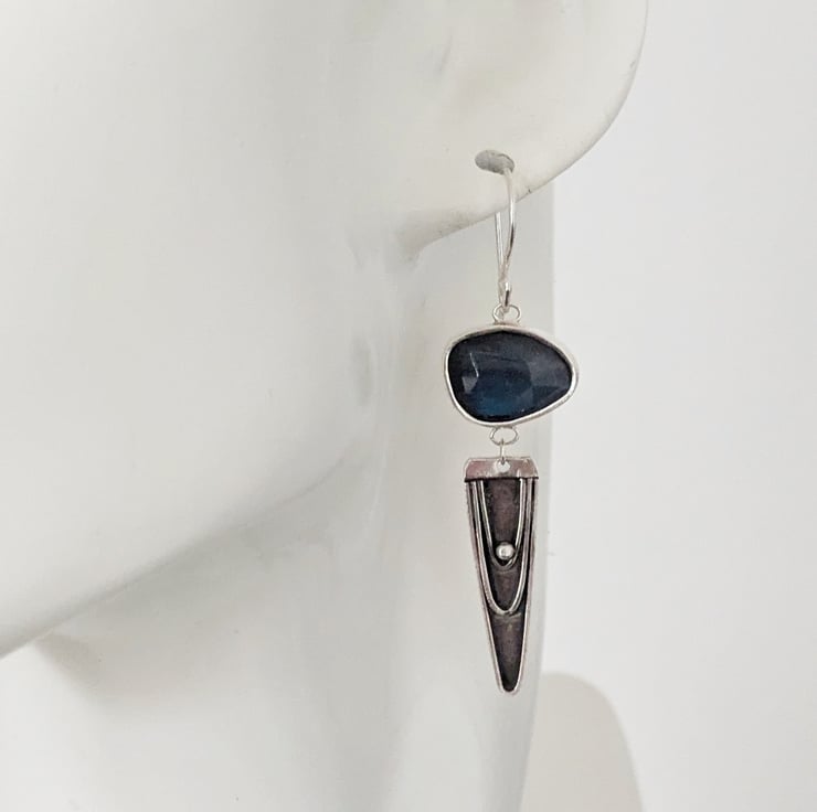 Statement earrings with translucent labradorite stones and silver dangles inspired by art nouveau design.