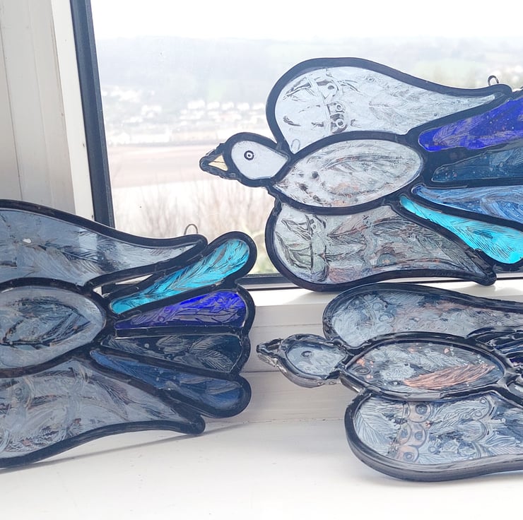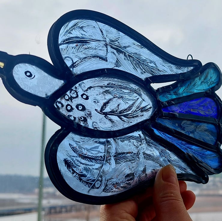 Lovely unique flying bird. I have 3 of these birds, all same basic design but all slightly different. Using a range of recycled and vintage blue glass. Painted with pearl and bronze lustre and then fired in the kiln. Made using traditional leading techniques and come with cord to hang in a sunny window.
