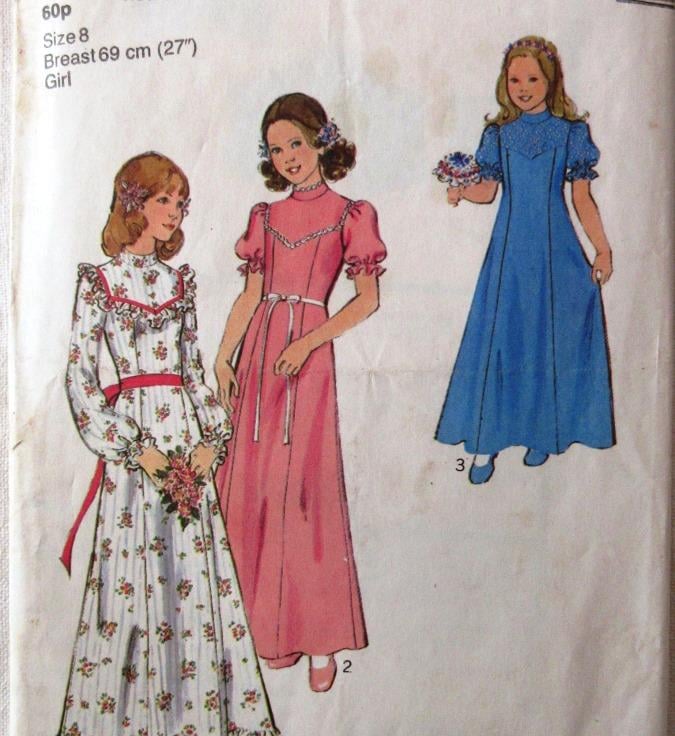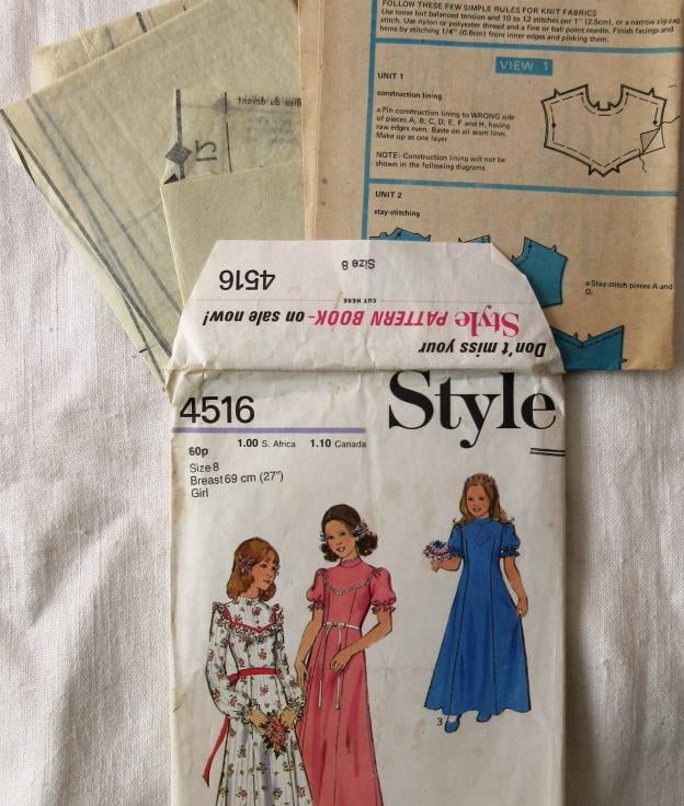 A sewing pattern for a girl's bridesmaid's dress in size 8 (chest 27"/69 cm, Style 4516). The lined panelled dress has shaped yoke, stand collar, back zipper and sleeves gathered into armholes with elastic casing to form a frill. Views 1 and 2 have ribbon trim. View 1 has long sleeves and self fabric frills. Views 2 and 3 have short sleeves. View 2 has trim. View 3 has yoke and sleeves in contrasting fabric. The pattern has all been used. The side back pattern piece is slightly torn. The pattern is dated 1973.