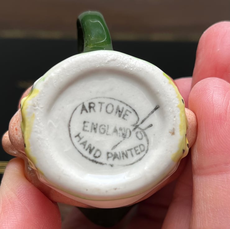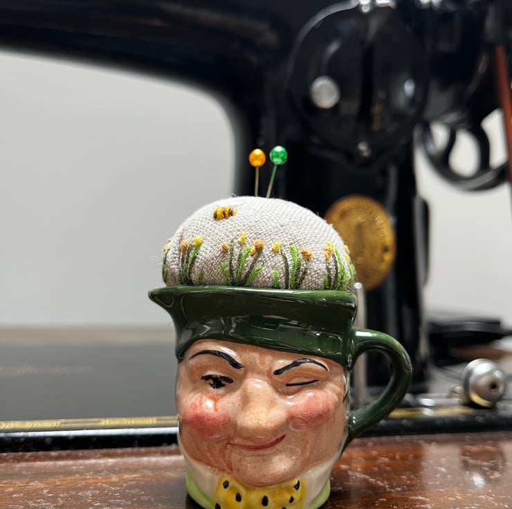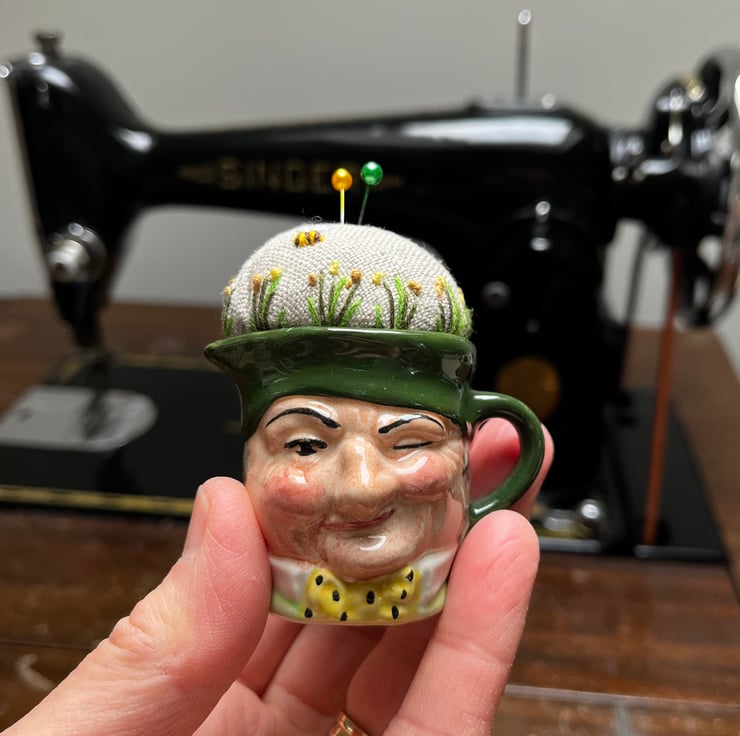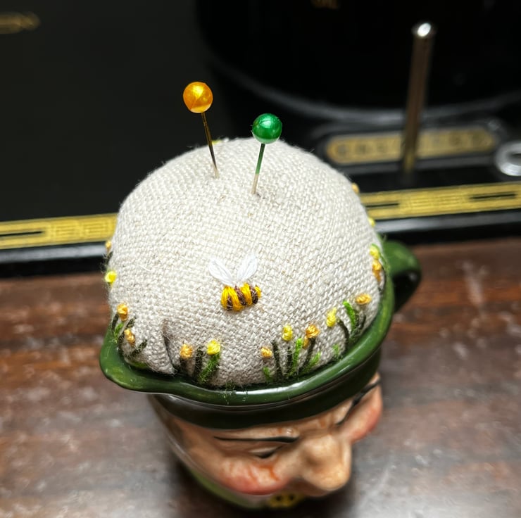 Pincushion in a vintage Toby jug with winking face on both sides of the pot. The reclaimed linen cushion has been embroidered with tiny flowers and a bee.