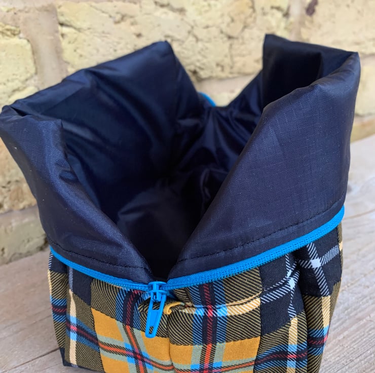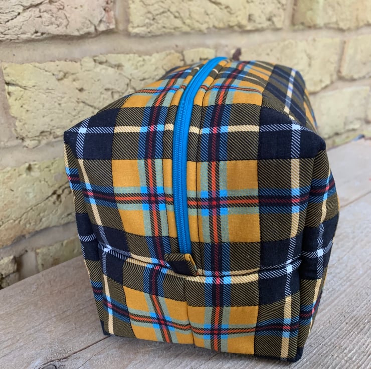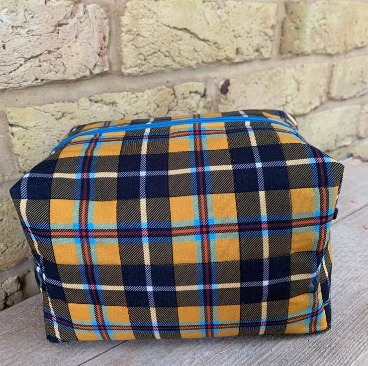 The box shaped Wash Bag (or large makeup bag) is made from tartan cotton fabric in dark yellow, navy, orange, turquoise and white colours.