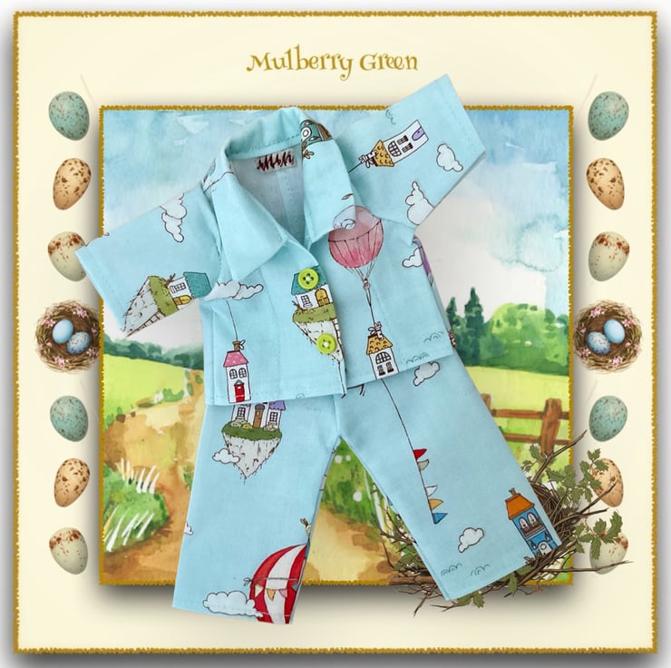 A cute little pair of pyjamas to fit the Mulberry Green characters in a dreams print. The pyjamas are made from best quality cotton and are tailored like real pyjamas. They fasten with poppers under two little buttons.