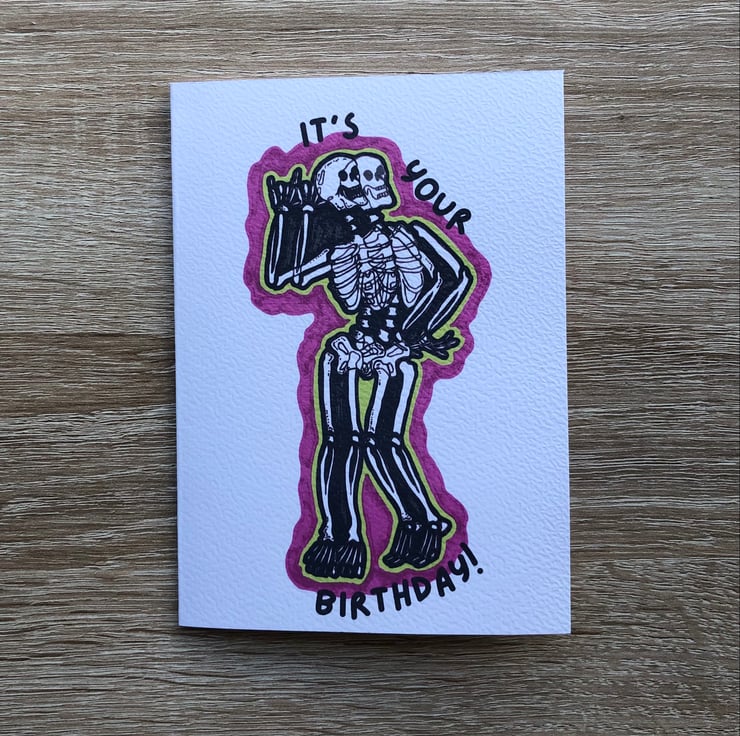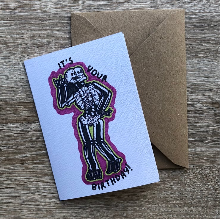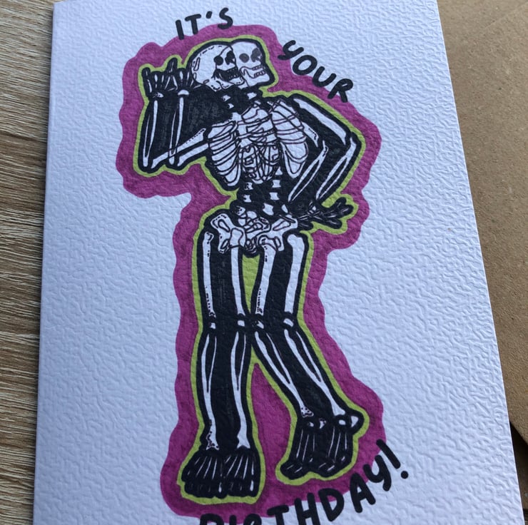 This beautiful, handcrafted birthday card is perfect for gifting to someone who appreciate handmade pieces on their special day. Made from high-quality 300gsm card and printed with a original, fun, dancing skeleton design and blank inside for your message.