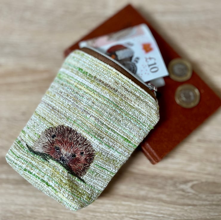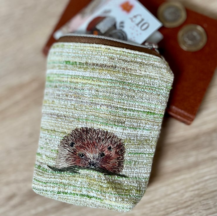 It has been made from a variegated textile which was a furnishing fabric sample and has been decorated with the a hand embroidered hedgehog.
