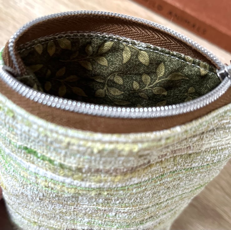 The bag fastens with a brown nylon coil zip with a metal slider and is lined in a contrasting textile of a green cotton with a leaf pattern.