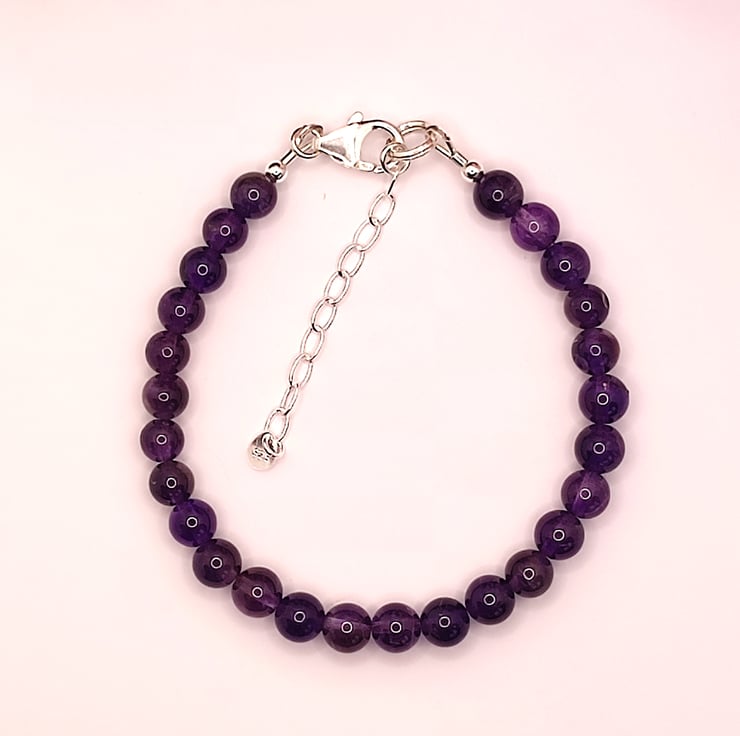 Natural gemstone Amethyst 6mm beaded bracelet with Sterling silver lobster clasp plus a 2 inch extension chain. Made to a length to fit a standard Adult wrist 7 inches but with an added extension chain the length can be adjusted up to another 2 inches.