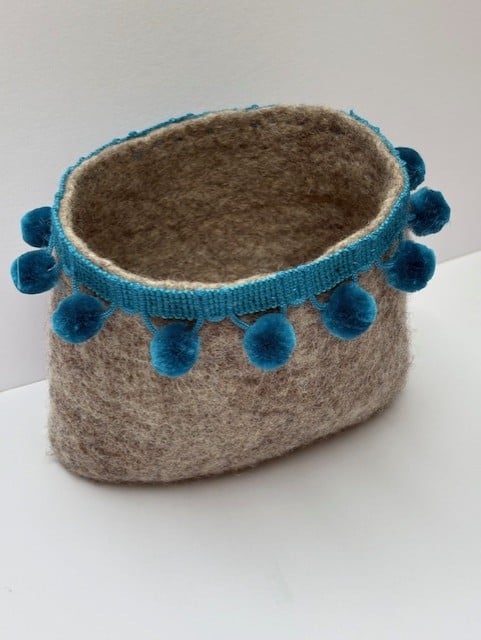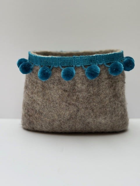 This cute little plant pot holder has been made with grey wool using the wet felting process. It has them been embellished with a turquoise bobble trim. It can be used to put a plant pot or vase in or as a container for bits and bobs or a desk tidy. It measures 11.5 cm in height and 43.5 cm in diameter.