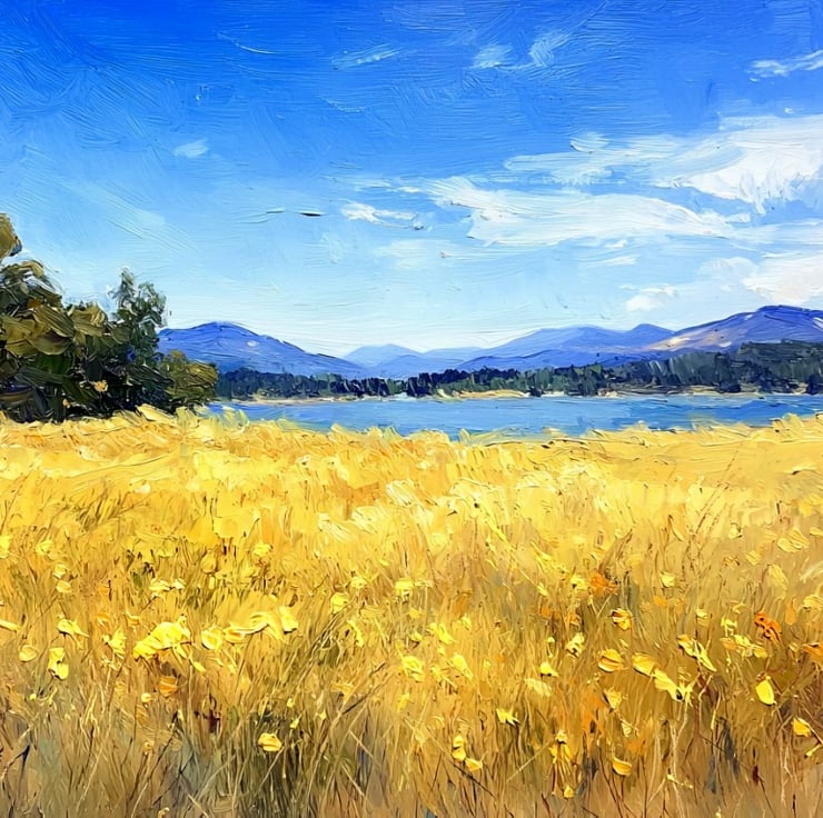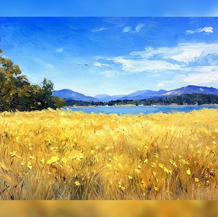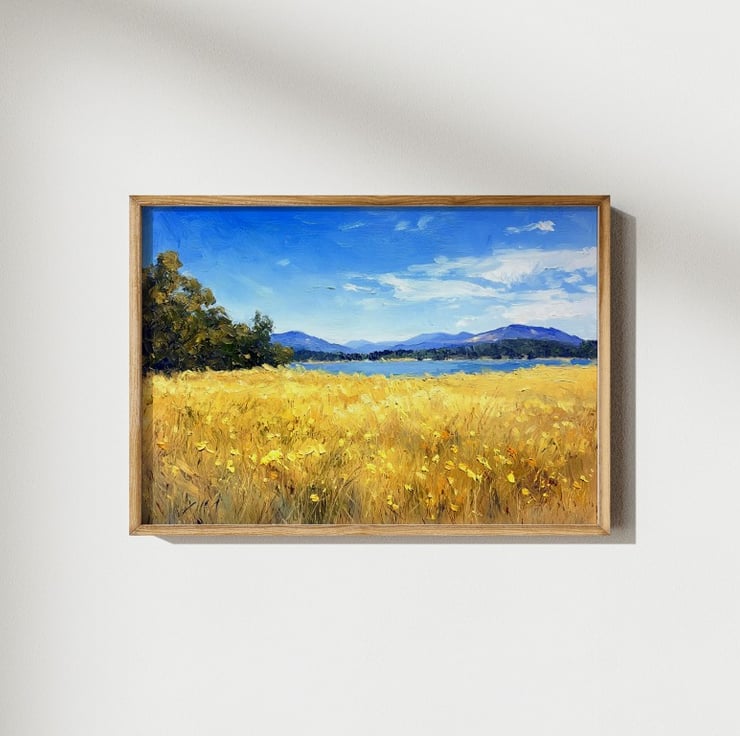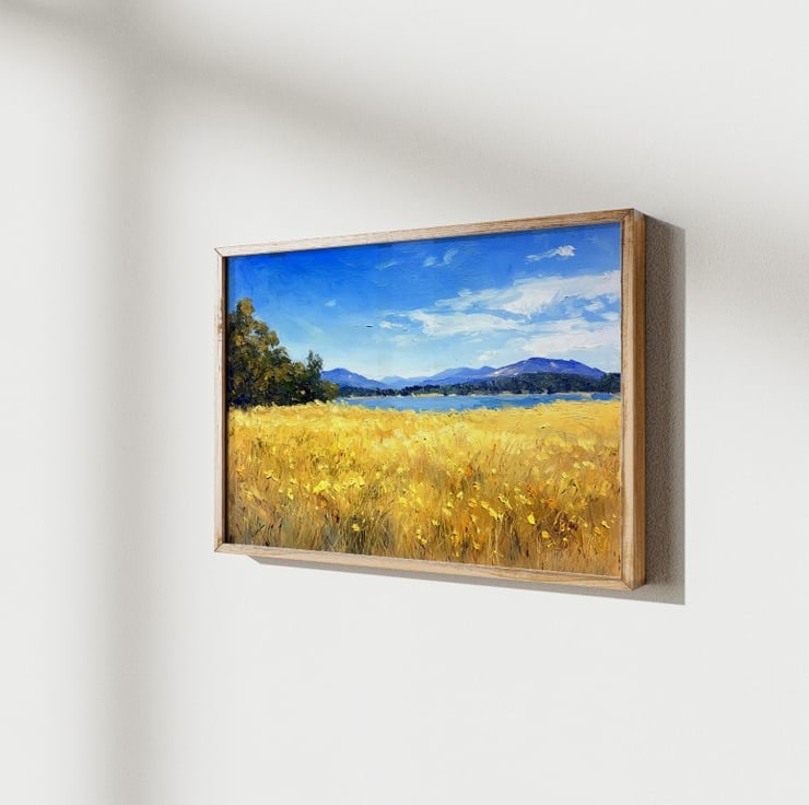 Golden Meadow Oil Painting is a breathtaking landscape artwork that captures the warmth and serenity of a sunlit field. The painting showcases a vast golden meadow filled with wildflowers, leading towards a tranquil blue lake with rolling mountains in the distance. The contrast between the warm golden tones of the grass and the cool blues of the sky and water creates a harmonious and inviting composition.