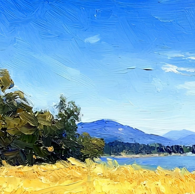 The artist’s expressive brushstrokes bring movement to the scene, mimicking the gentle sway of tall grasses in the breeze. The textured impasto technique adds depth, making the meadow feel alive with warmth and light. The distant mountains provide a sense of depth and vastness, drawing the viewer into this peaceful retreat.